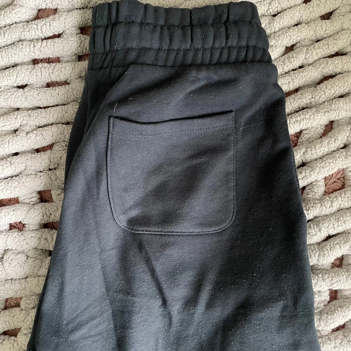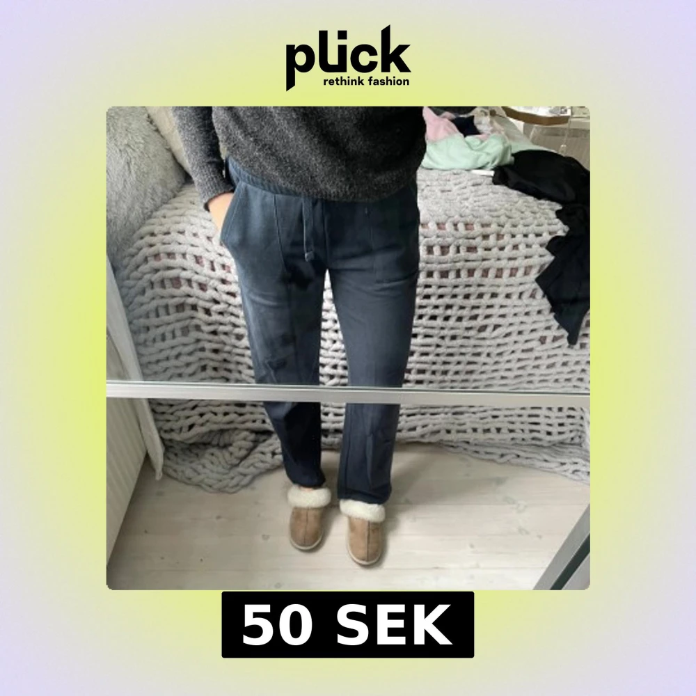 Mörkblå mjukisbyxor från 157 med dragsko i midjan och raka ben. Byxorna har resår i midjan, två fickor fram och en bakficka.