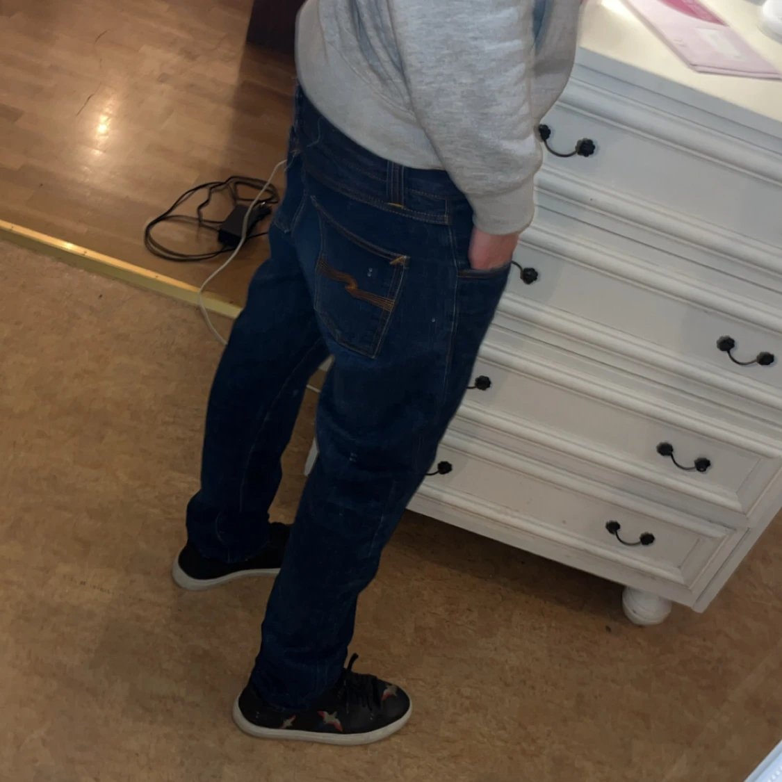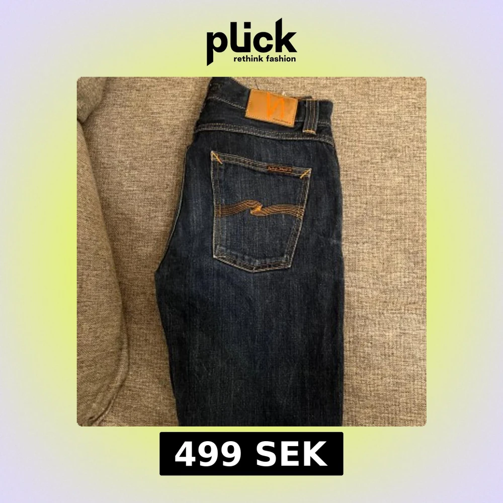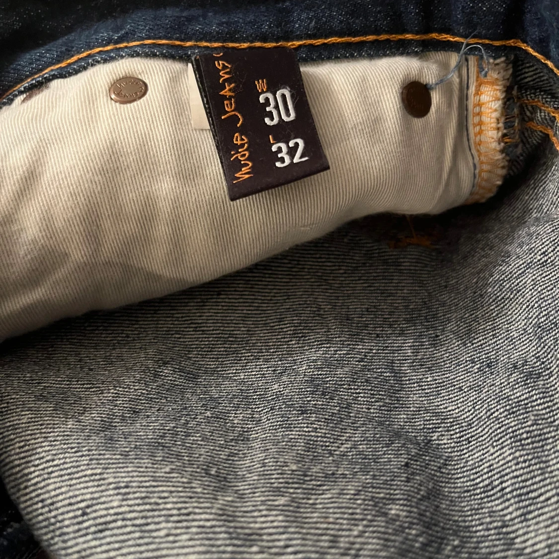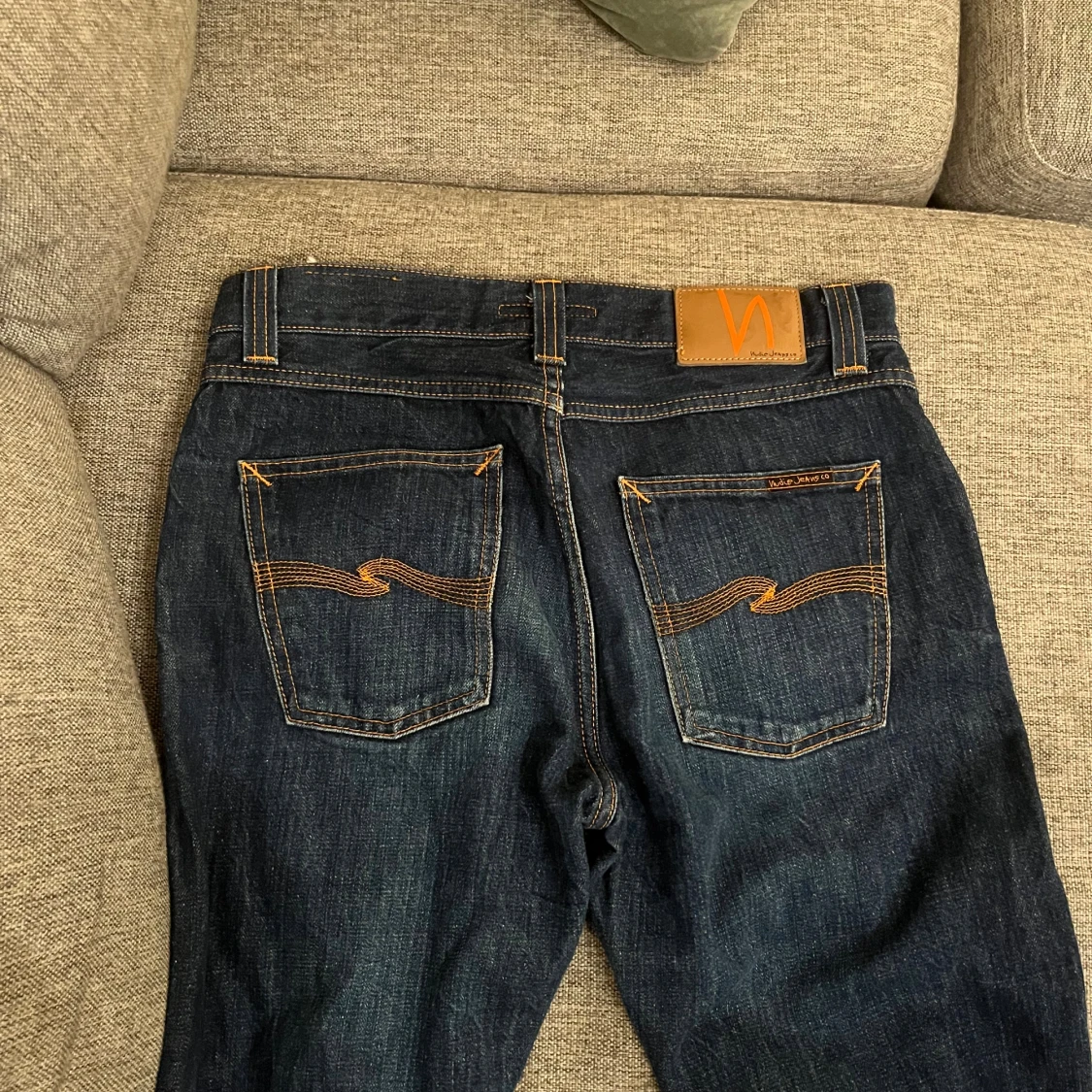 Säljer ett par mörkblå jeans från Nudie Jeans med klassisk orange söm på bakfickorna och läderpatch i midjan. Jeansen har rak passform och är tillverkade i slitstarkt denimtyg av bomull. Perfekta för dig som gillar stilrena och tidlösa jeans.