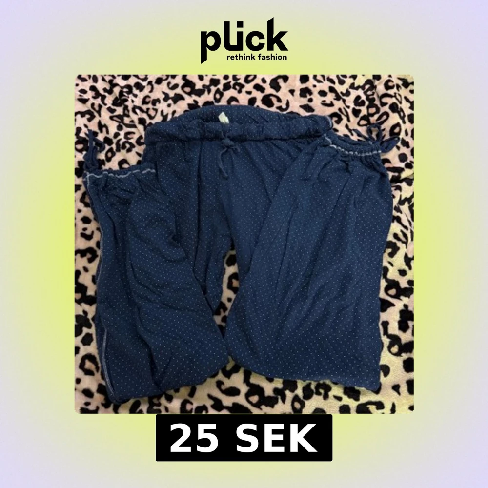 Säljer ett par mörkblå pyjamasbyxor med små vita prickar. Byxorna har resår i midjan och vid bensluten för en bekväm passform. Perfekta för en avslappnad stil.