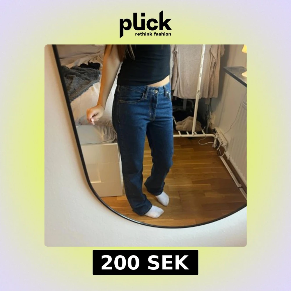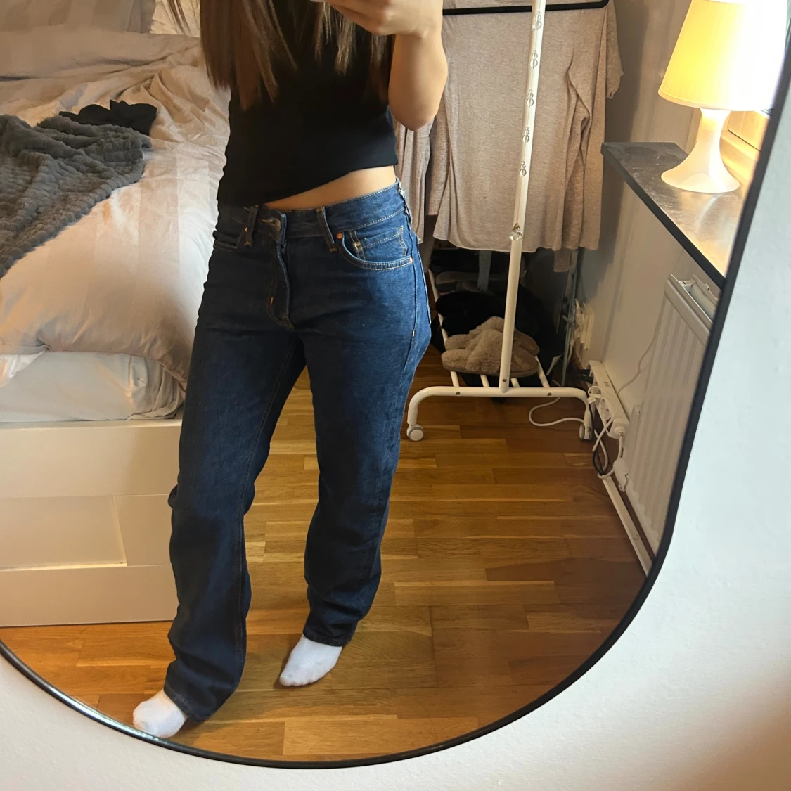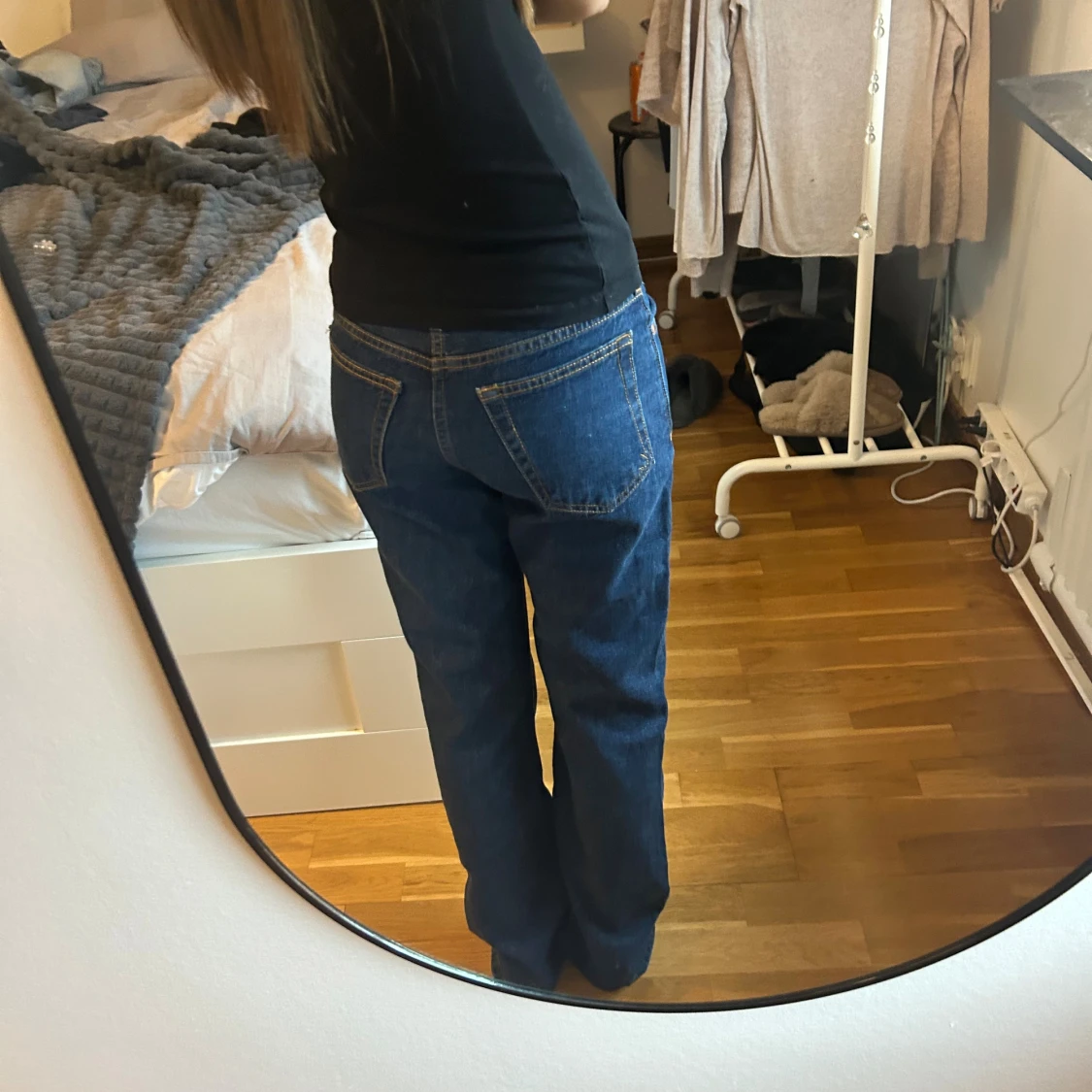 Säljer ett par klassiska mörkblå jeans med raka ben och normal passform. Från bikbok