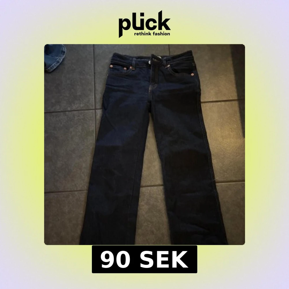 Mörkblå raka jeans med kontrastsömmar. Uppsyda för en person som är 158 cm.