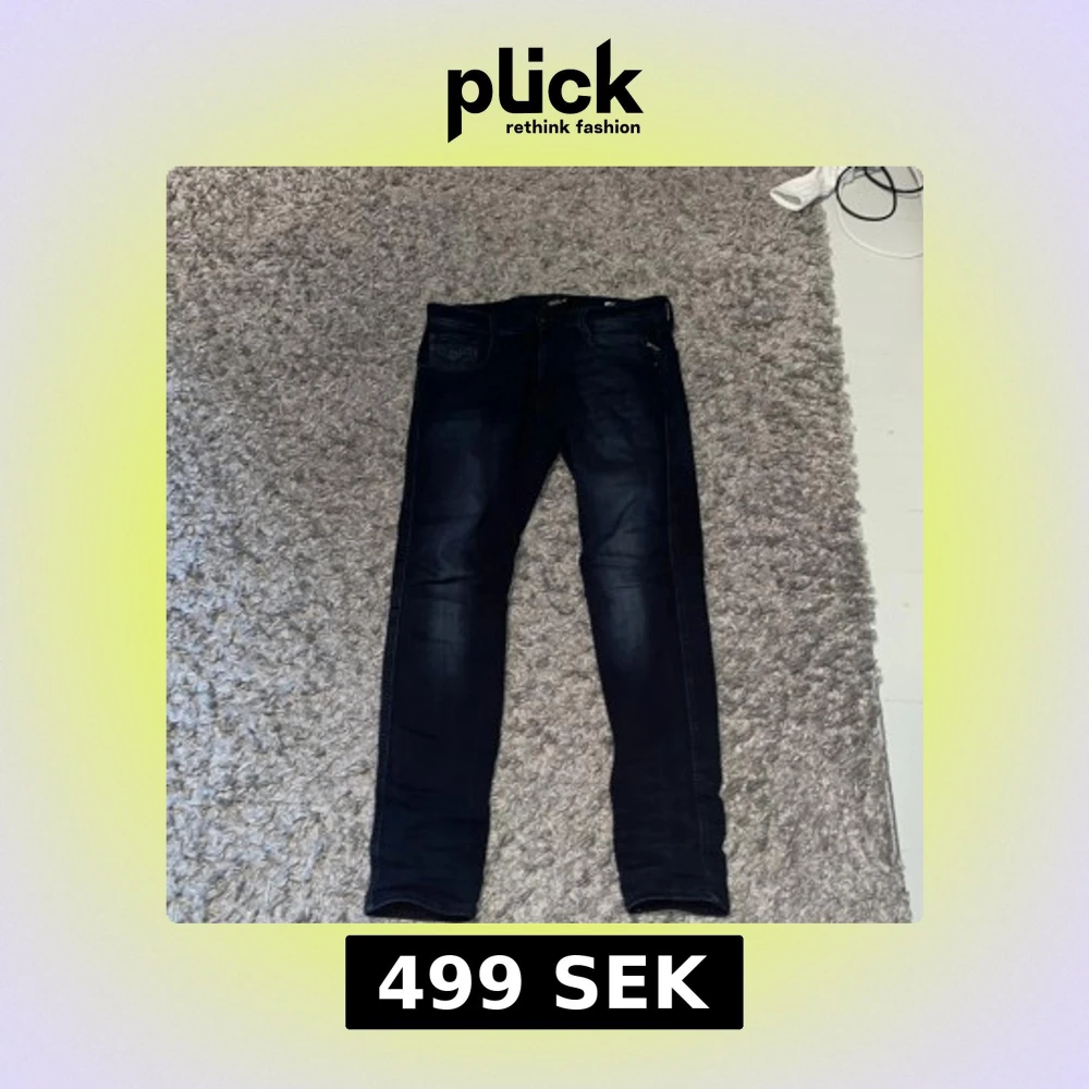 Säljer ett par mörkblå Replay Anbass jeans slim fit. Replay-läderpatch bak. Storleken är 29/30. Snygga utan några defekter.