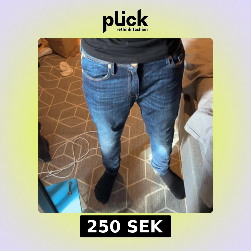 Säljer ett par mörkblå jeans från Replay med klassisk femficksdesign och snygga slitningar framtill. Jeansen har en slim passform och är tillverkade i mjukt denimtyg med Replay-logga på bakfickan. Perfekta för dig som gillar stilrena och bekväma jeans.