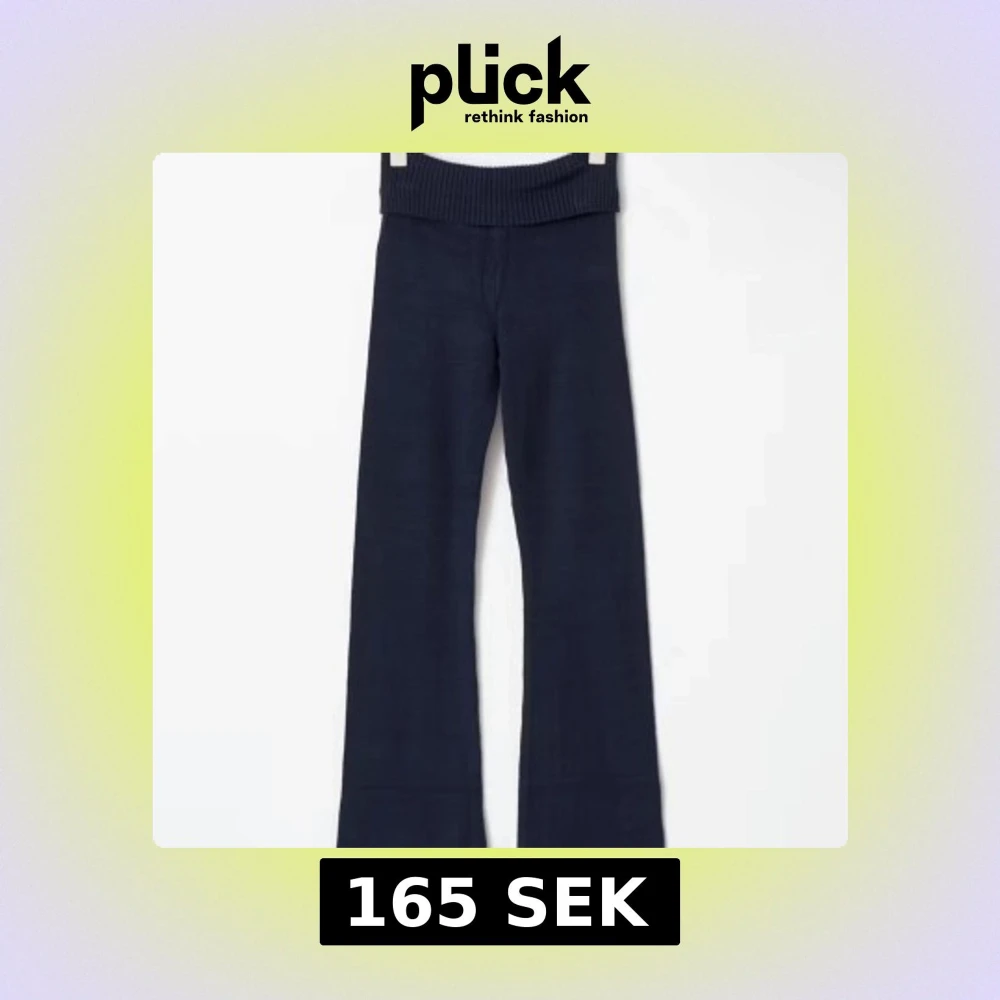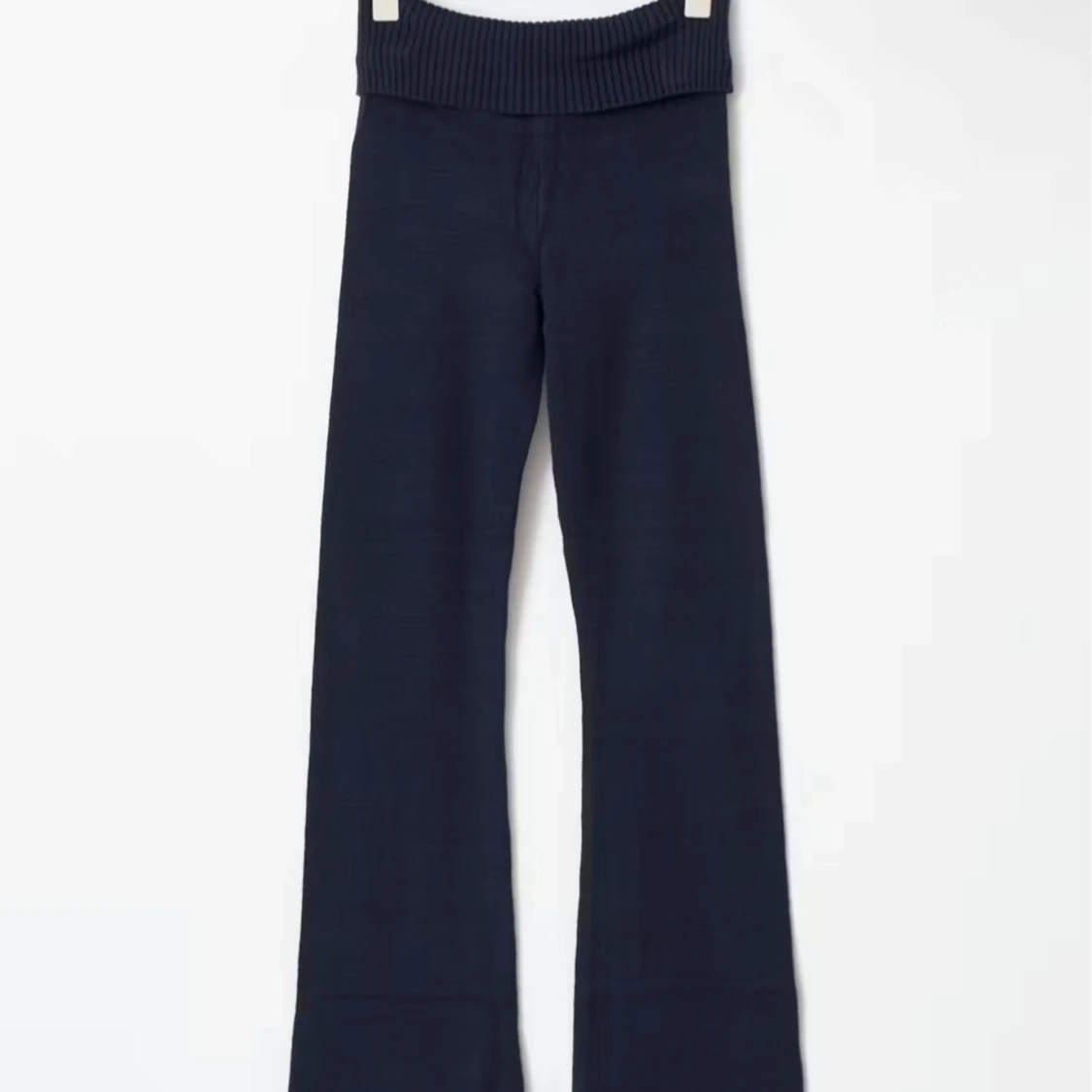 Mörkblå stickade byxor med bred ribbad midja och utsvängda ben. Perfekta för en avslappnad och trendig look. Mjukt material som ger en bekväm känsla hela dagen.