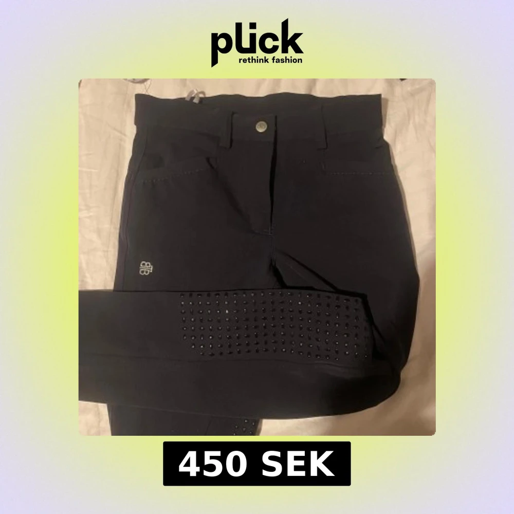 Snygga mörkblå ridbyxor med glittrande detaljer och silikonförstärkning vid knäna. Byxorna har en knapp och dragkedja framtill samt en glittrig detalj på bakfickan. Perfekta för unga ryttare som vill ha stil och funktion. Köpte dem för 899kr där av säljer jag dem för 450kr