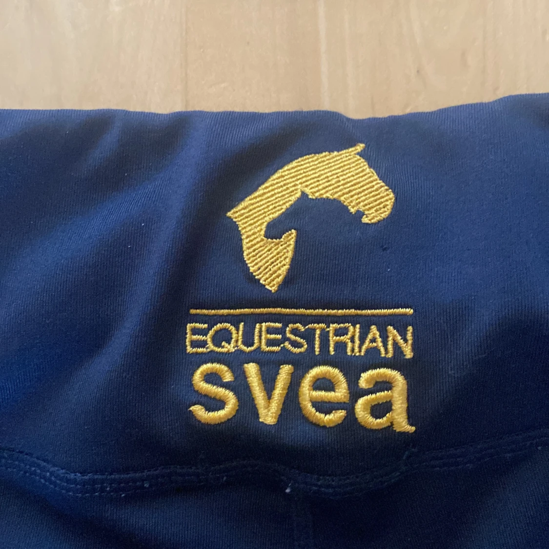 Snygga mörkblå ridbyxor från Svea Equestrian med tryck på benen och logga bak. De har hög midja och är gjorda i stretchigt material med 90% polyester och 10% elastan, vilket gör dem riktigt bekväma för ridning. Perfekta för dig som gillar att rida och vill ha stil på stallet.