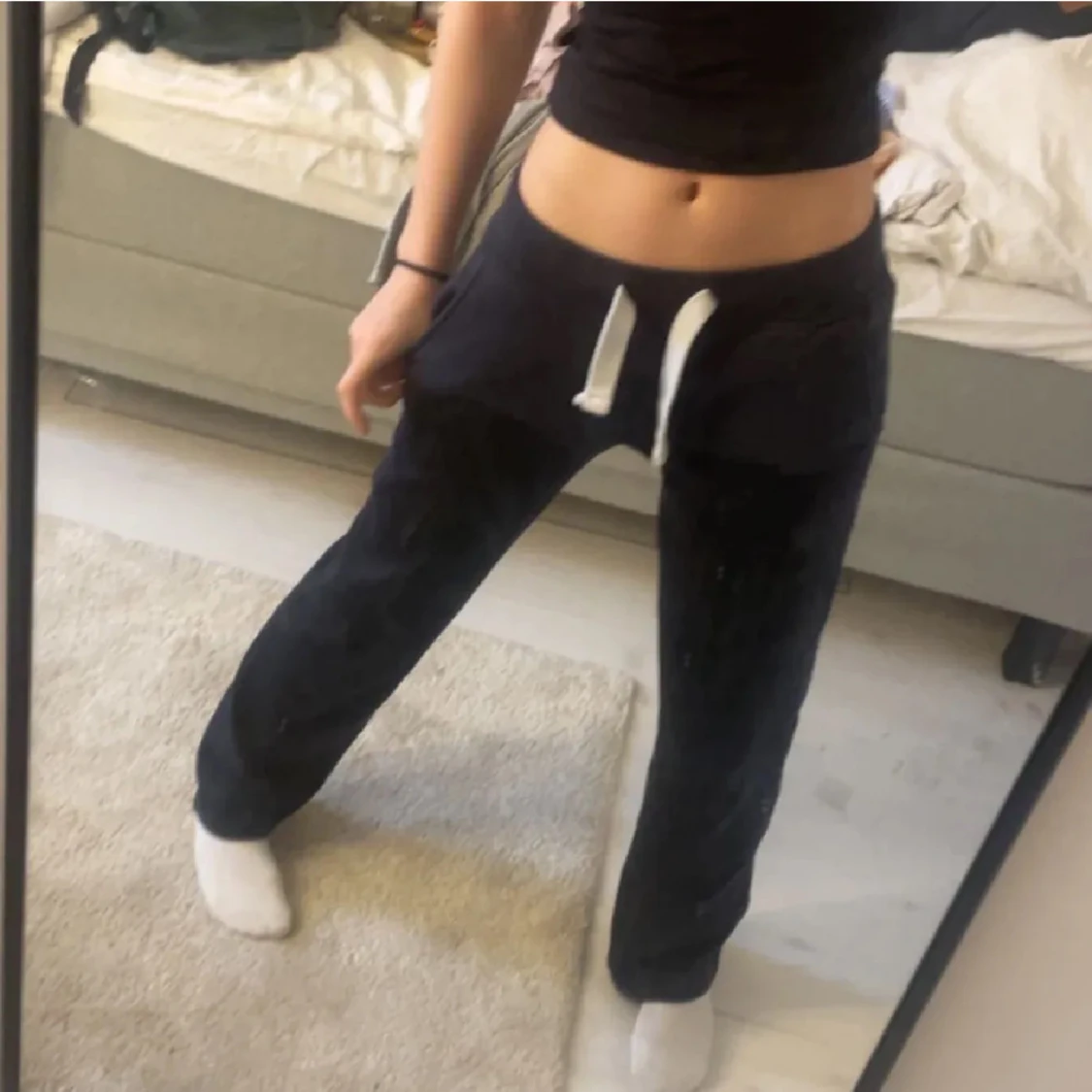 Säljer mina mjukisbyxor från russe merch för att de inte passar mig, de är mörkblåa med vit snörning i midjan! Raka i benen.