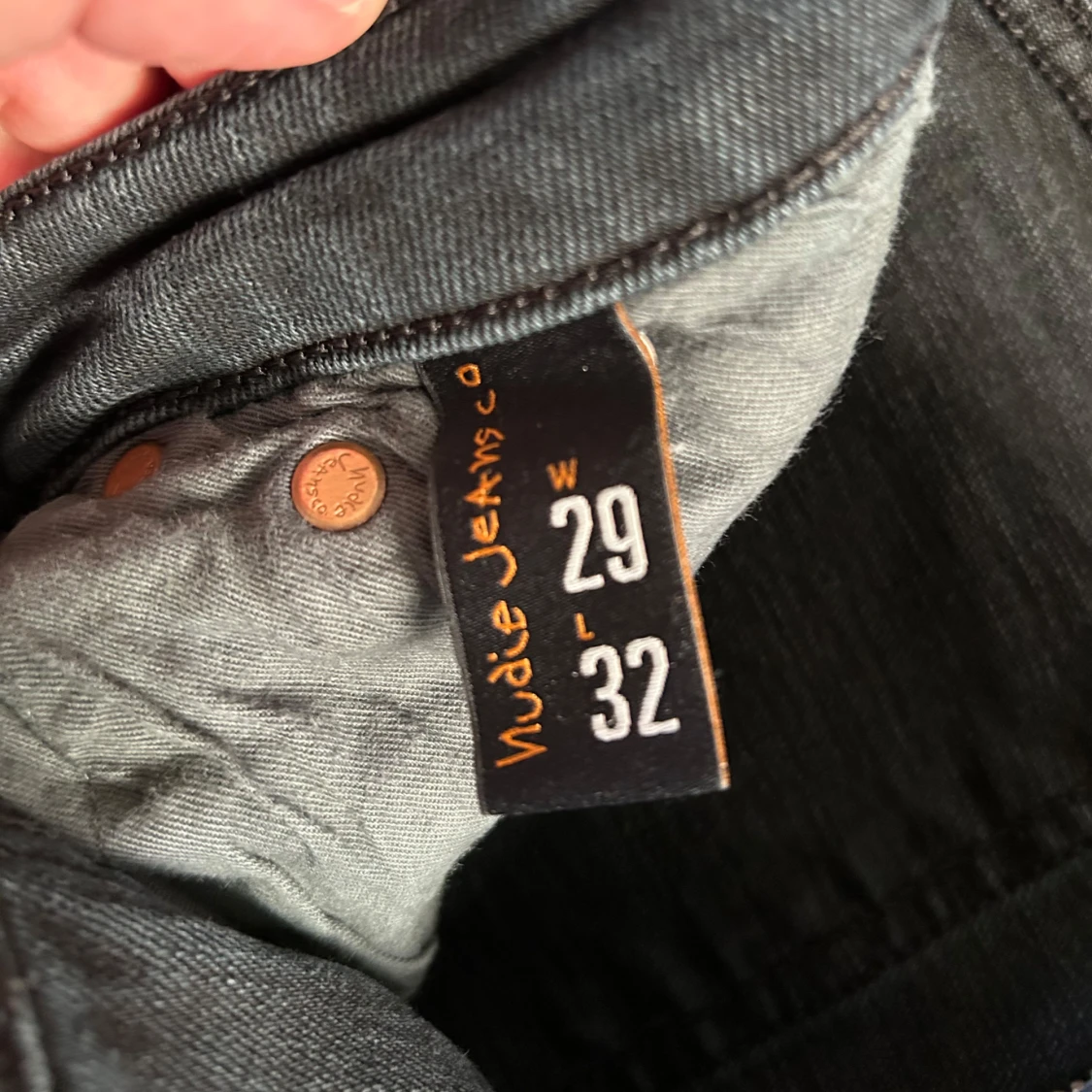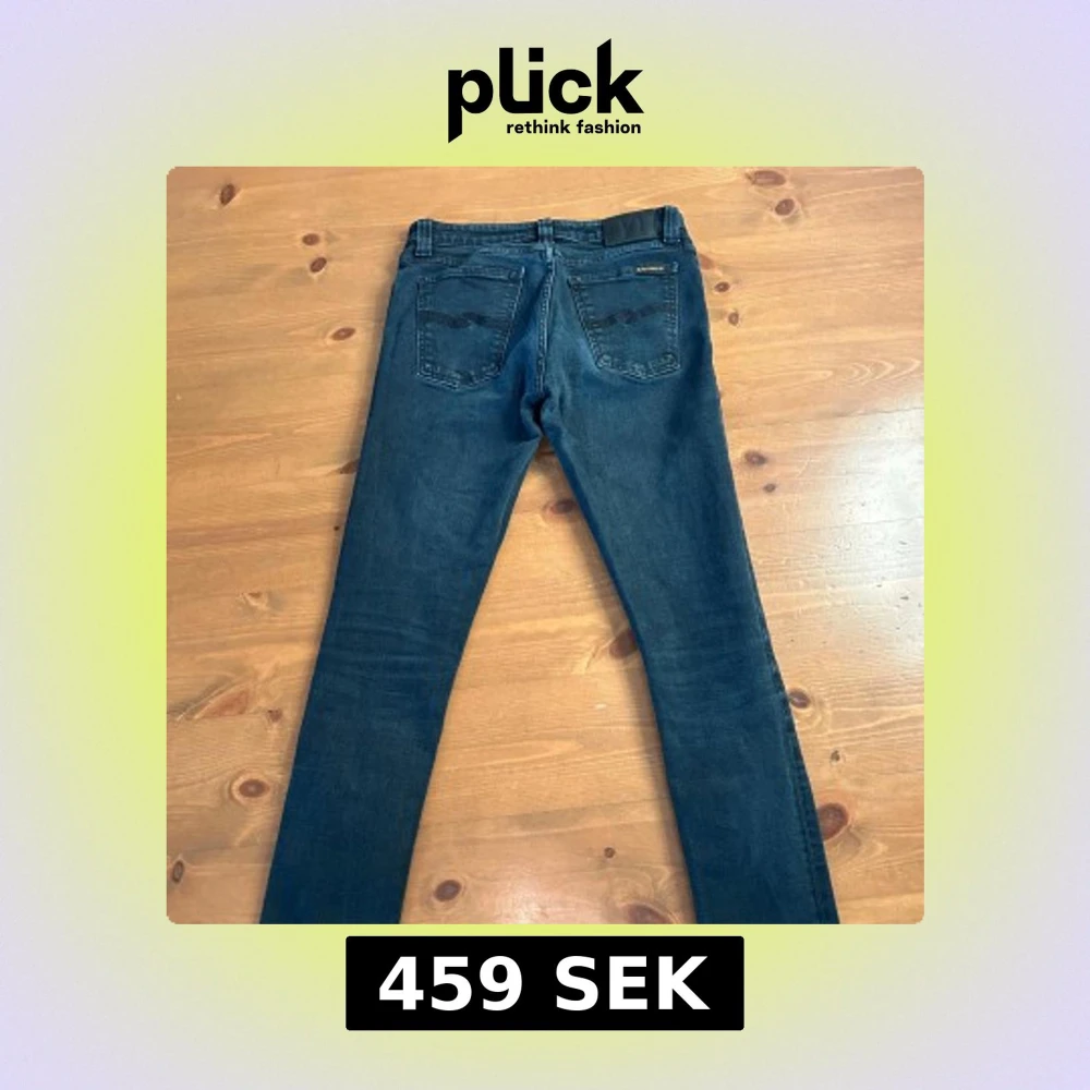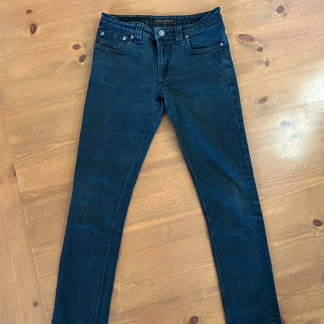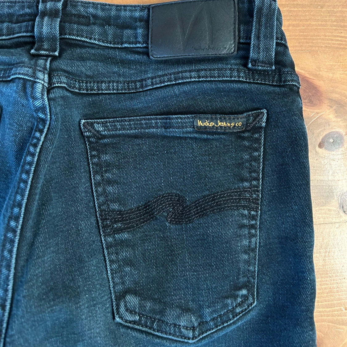 Snygga mörkblå jeans från Nudie Jeans med klassisk femficksdesign och svarta broderade detaljer på bakfickorna. Jeansen har normal midja och är tillverkade i bomullsdenim för en bra passform.