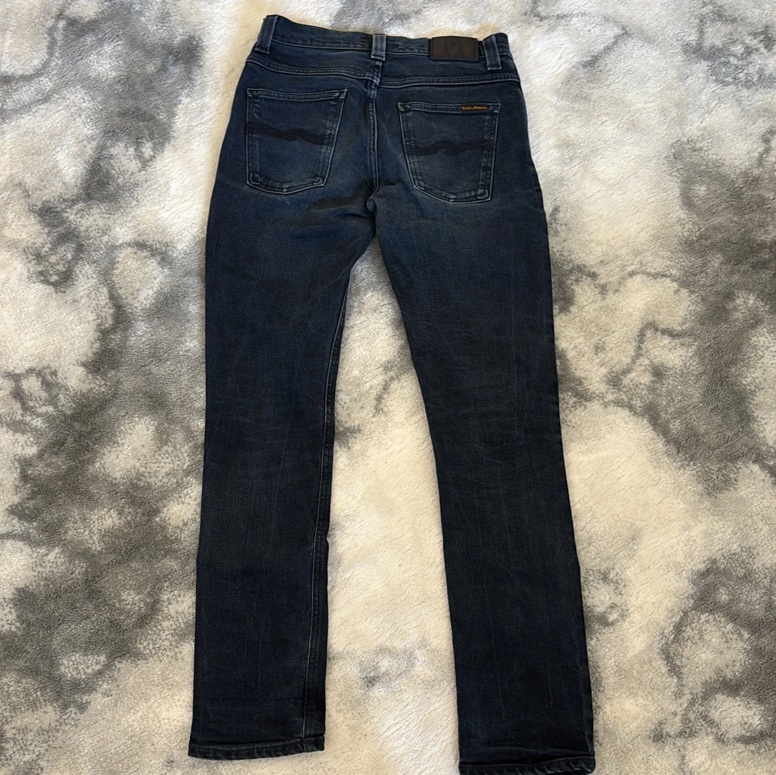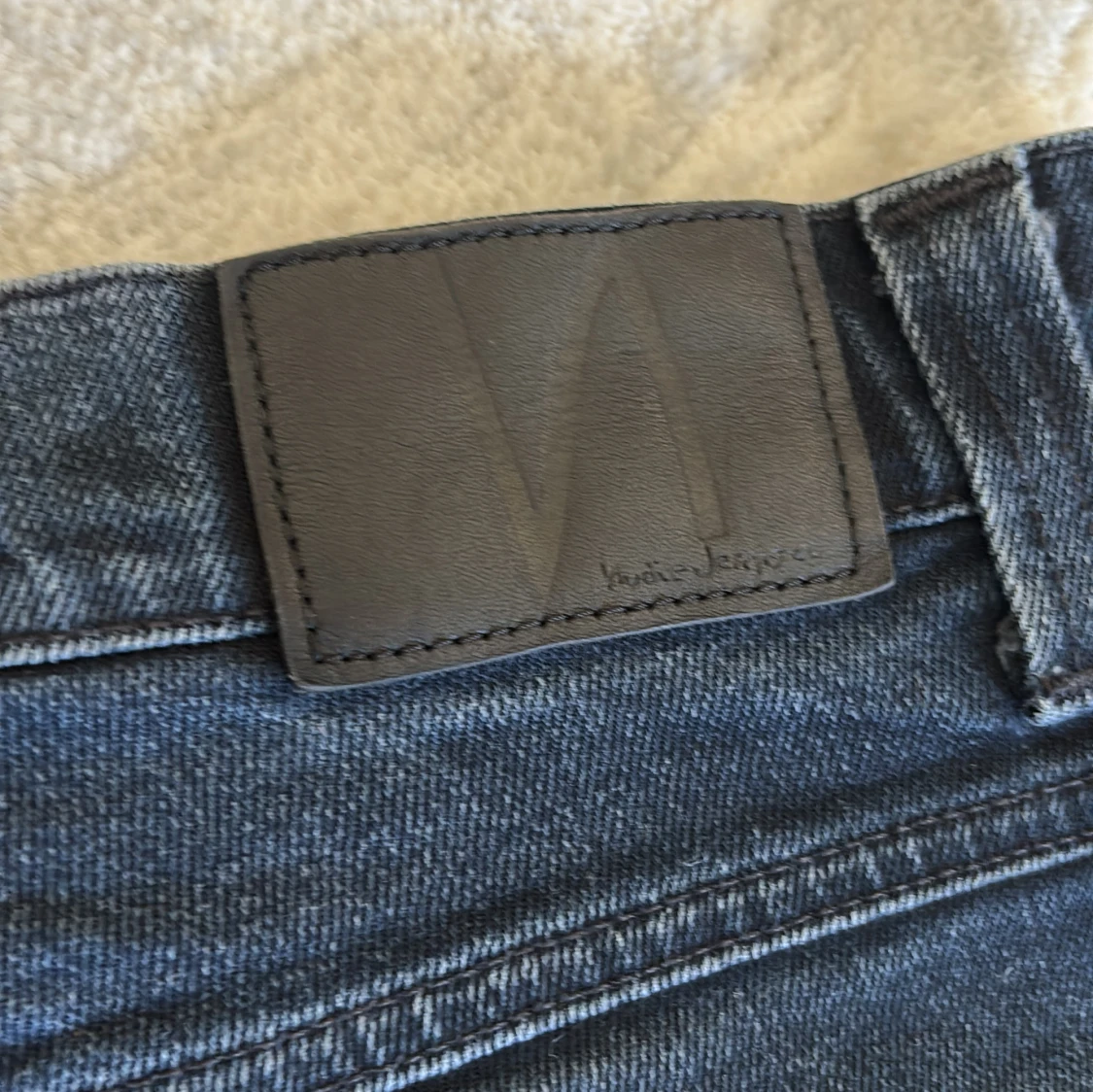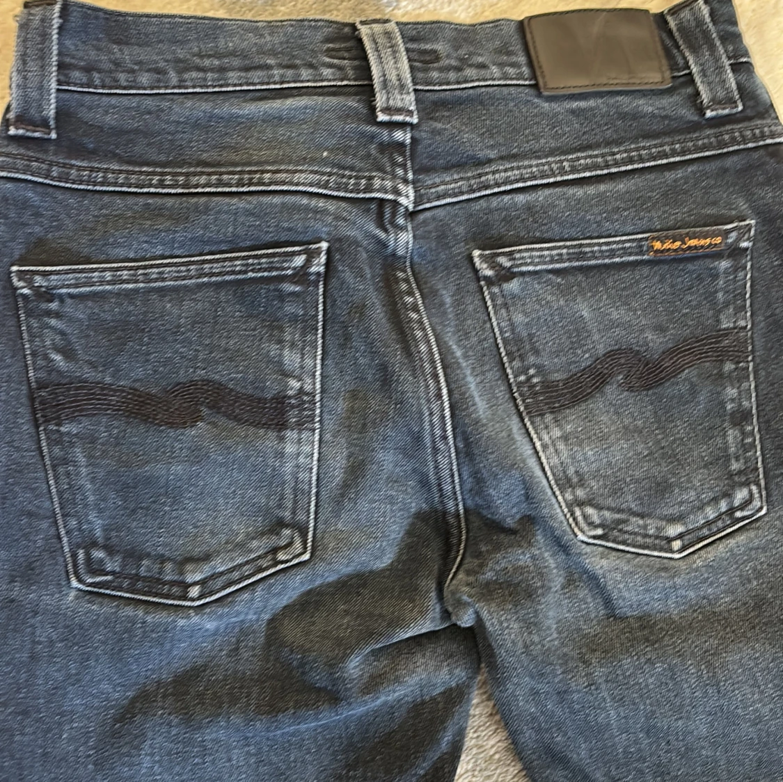 Snygga mörkblå skinny jeans från Nudie Jeans med klassisk femficksdesign och vågig brodyr på bakfickorna. Jeansen har hög midja och är tillverkade i stretchig denim för en tight passform. Perfekta för dig som gillar en stilren och modern look.
