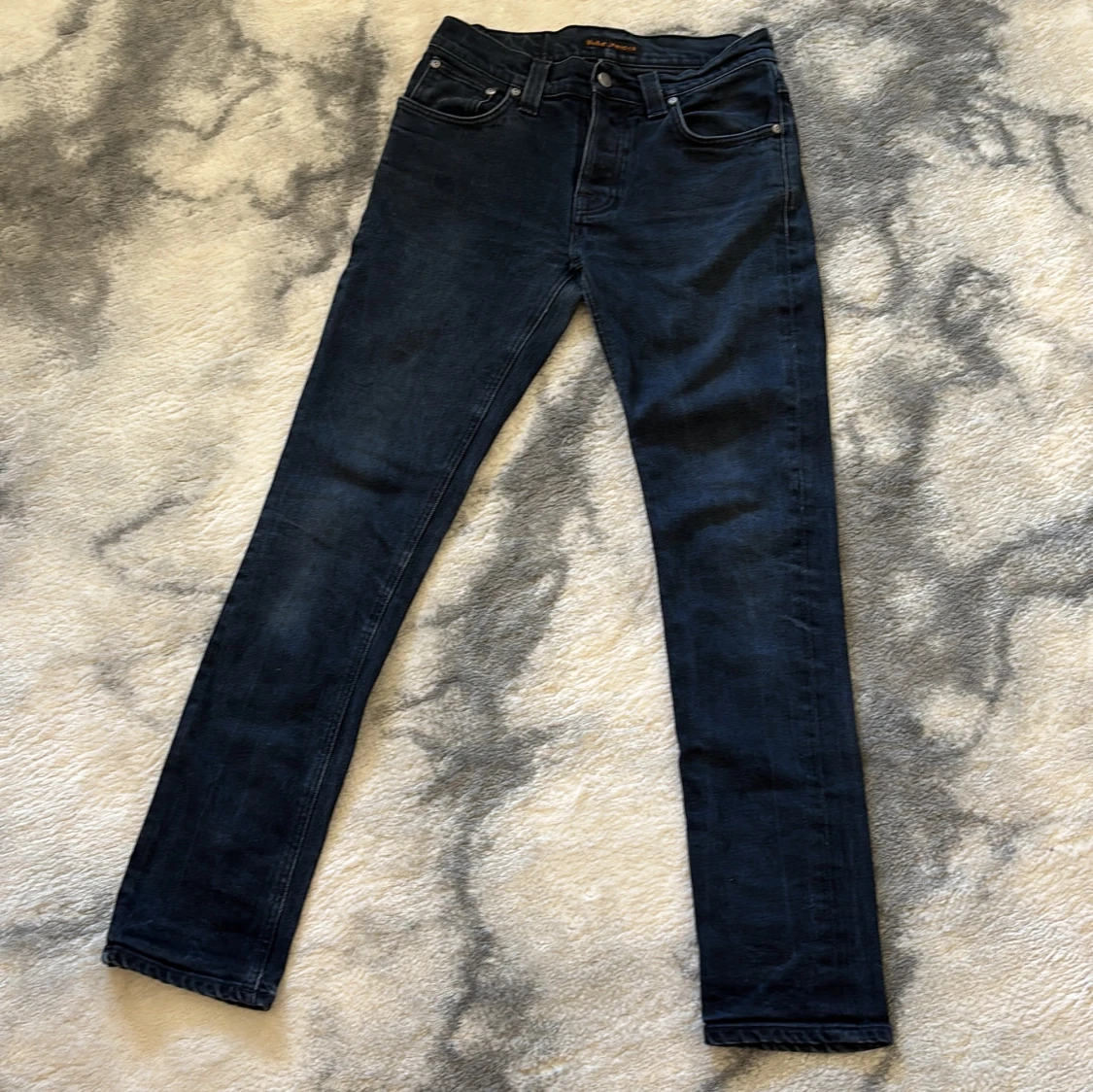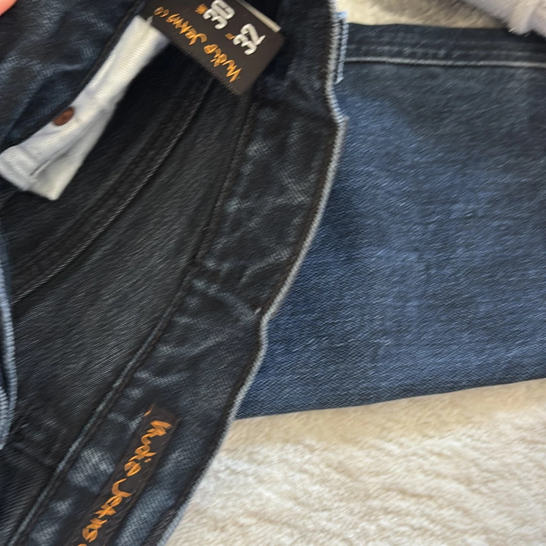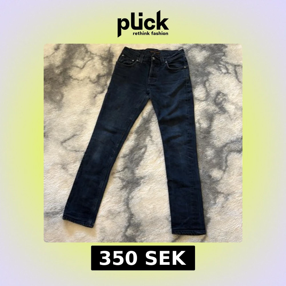 Snygga mörkblå skinny jeans från Nudie Jeans med klassisk femficksdesign och vågig brodyr på bakfickorna. Jeansen har hög midja och är tillverkade i stretchig denim för en tight passform. Perfekta för dig som gillar en stilren och modern look.