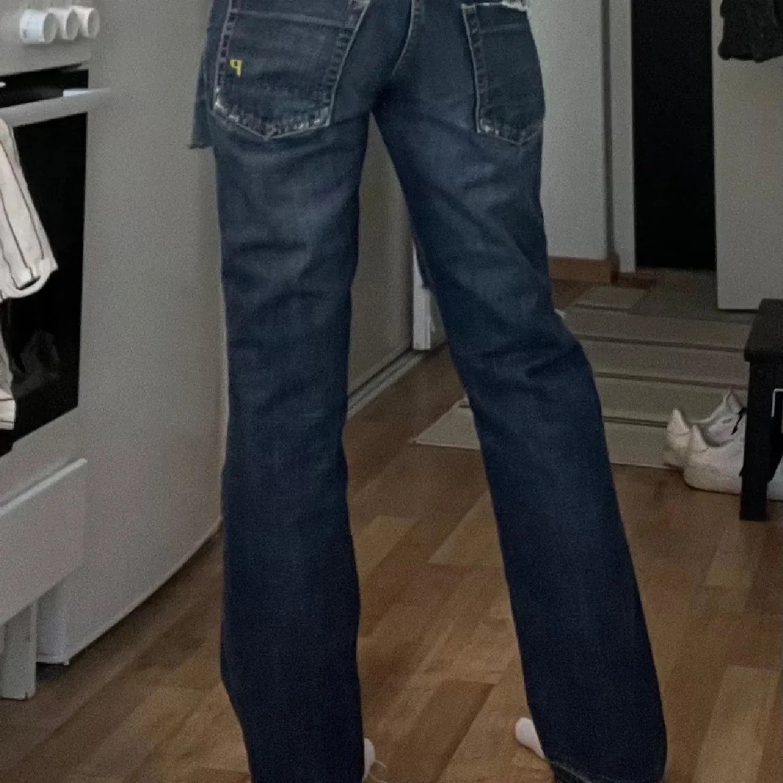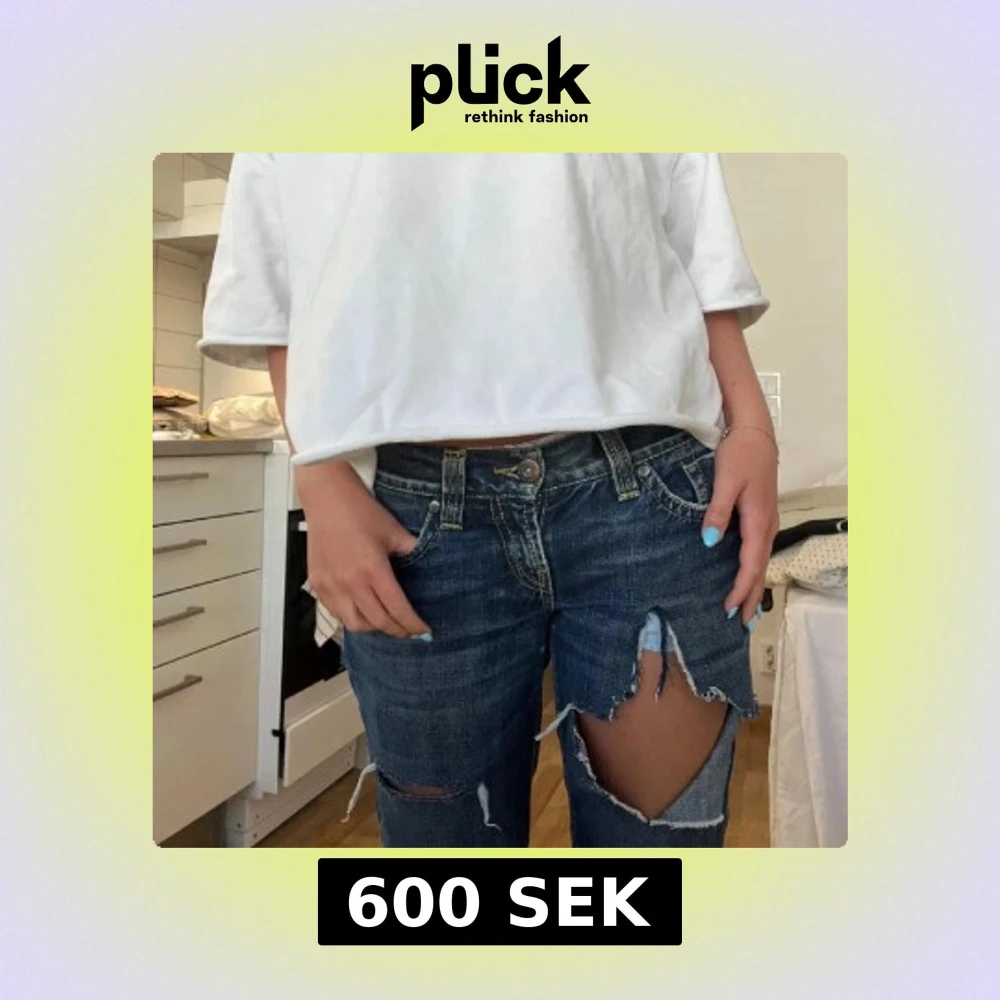 Säljer ett par mörkblå jeans med stora slitningar över knäna och bootcut-ben. Jeansen har låg midja och klassiska fickor både fram och bak. Perfekta för dig som gillar en edgy och avslappnad stil.