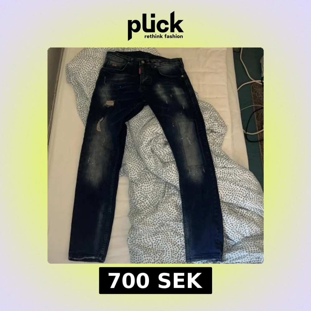 Säljer ett par mörkblå jeans från Dsquared2 med slitningar och färgstänk för en cool, använd look. Klassisk femficksmodell med raka ben och tydlig logga bak i midjan. Perfekta för dig som gillar streetstyle.