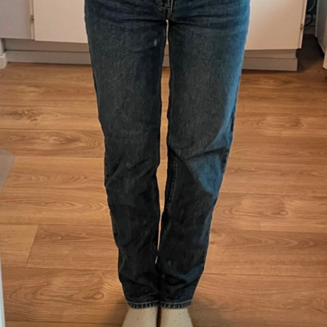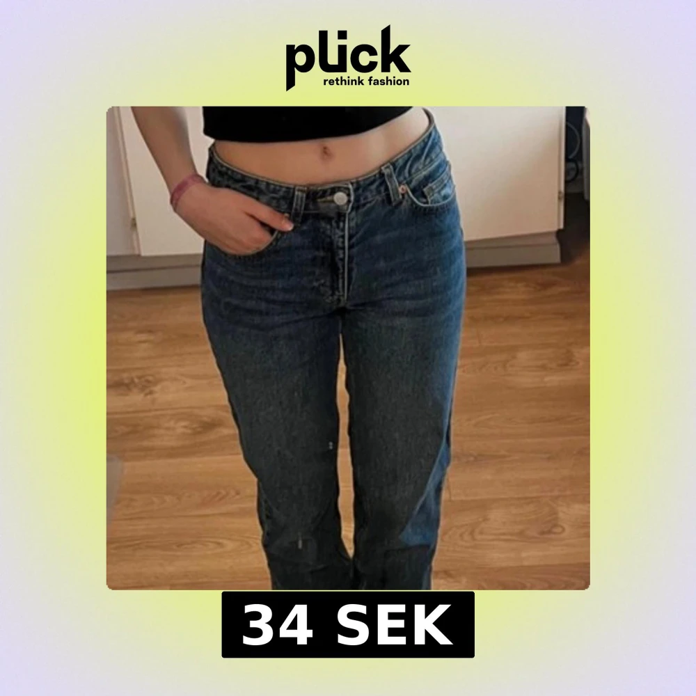 Ett par jeans i mörkblå med rak passform från Monki. Jeansen sitter även midwaist. Storlek är 34!