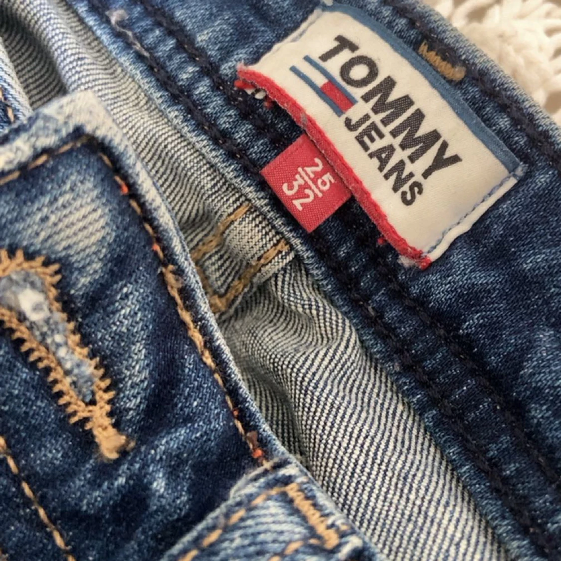 Säljer mina Tommy Jeans i strl 25/32. Använts 2 ggr. Det står att dem är mid rise men på mig blev dem väldigt låga. Ny pris 1300.