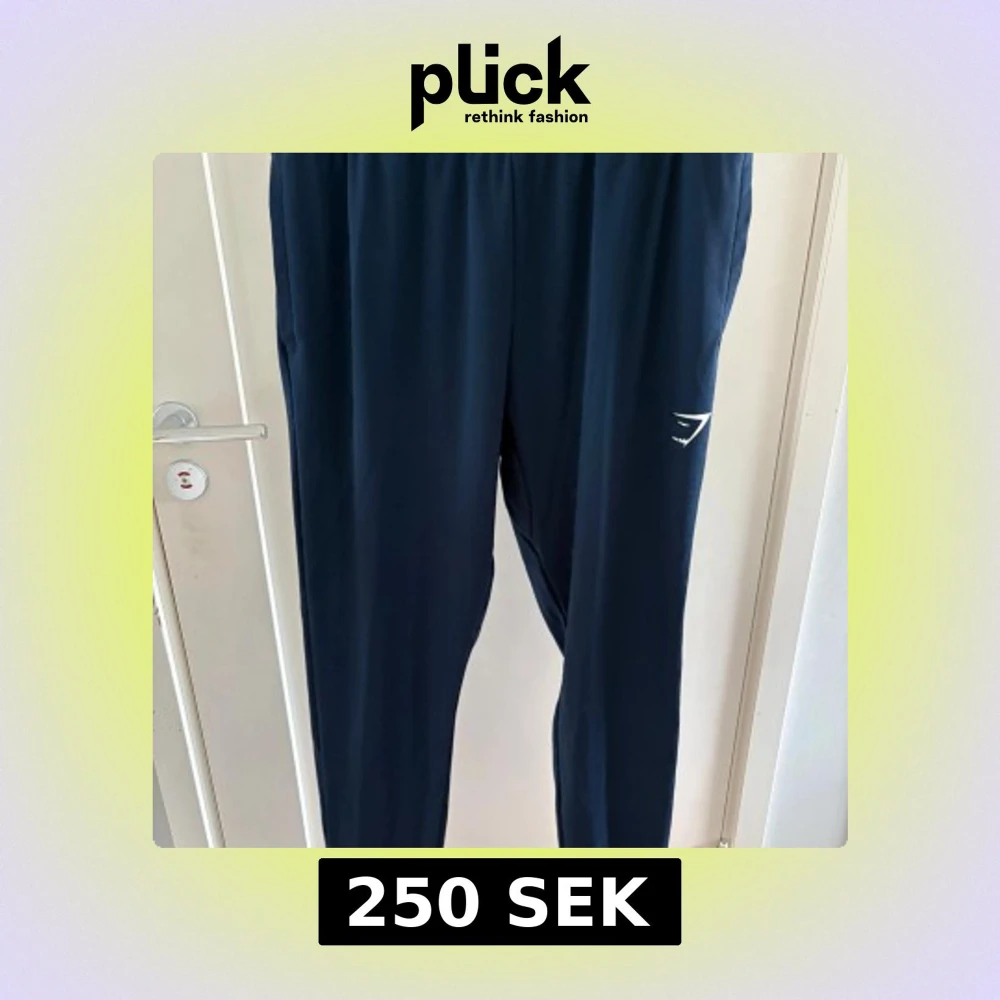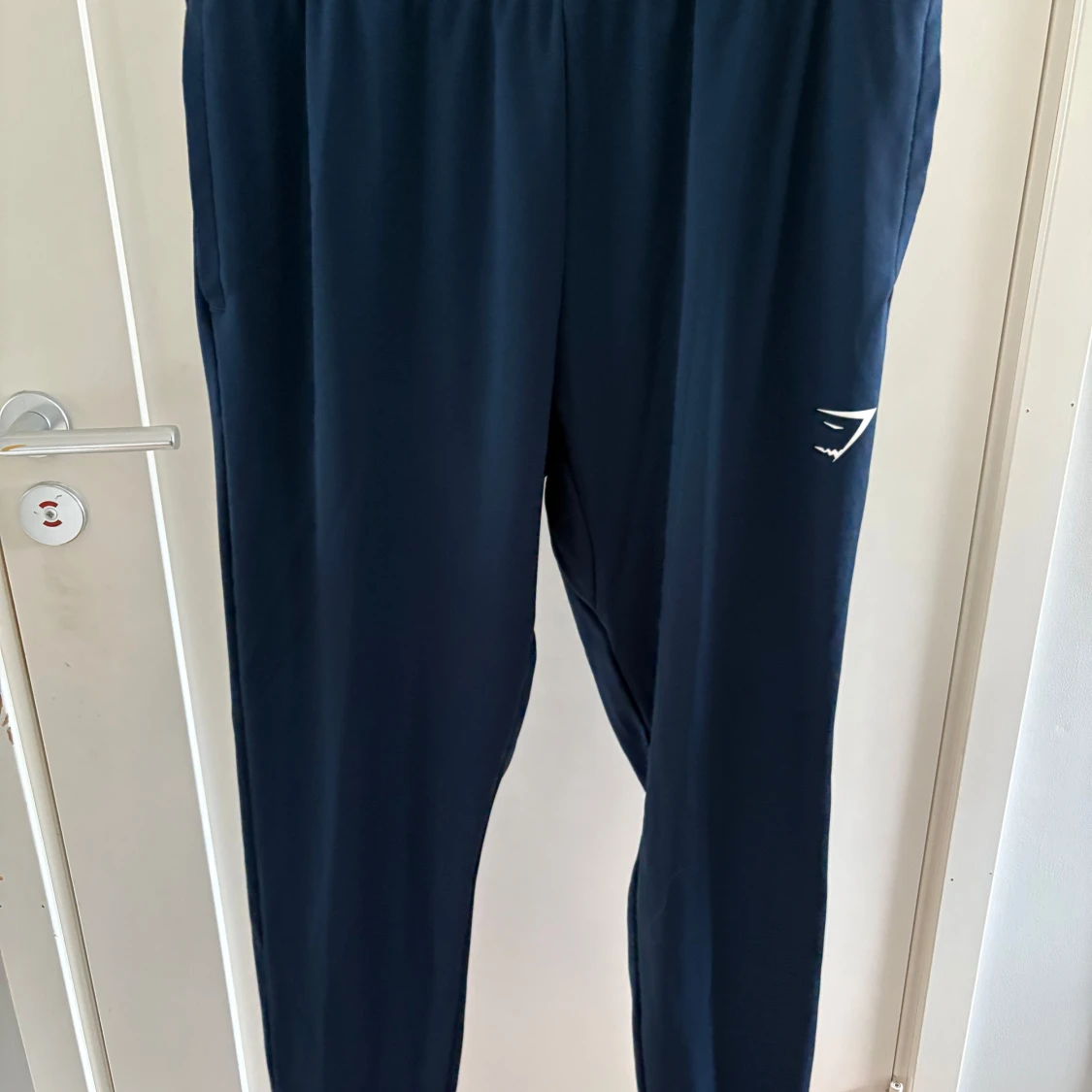Snygga mörkblå byxor från Gymshark med vit logga på benet. Byxorna har elastisk midja och smal passform som sitter perfekt. Mjukt material och diskreta fickor på sidorna.