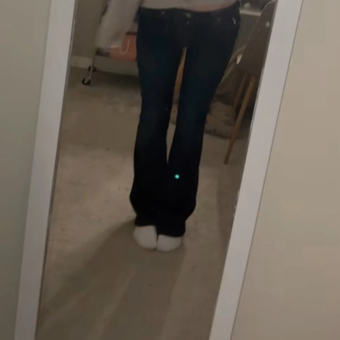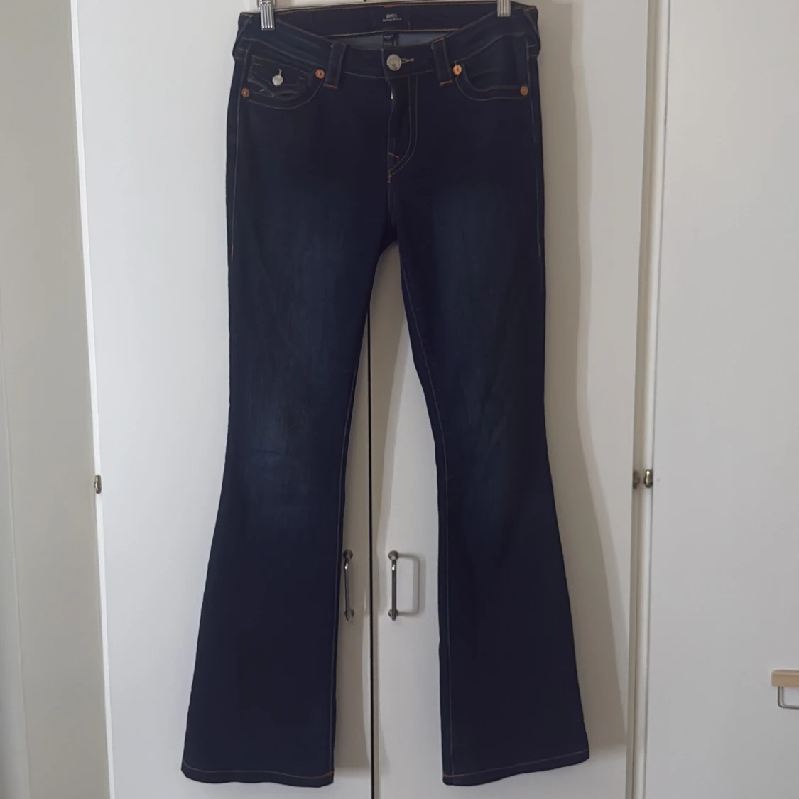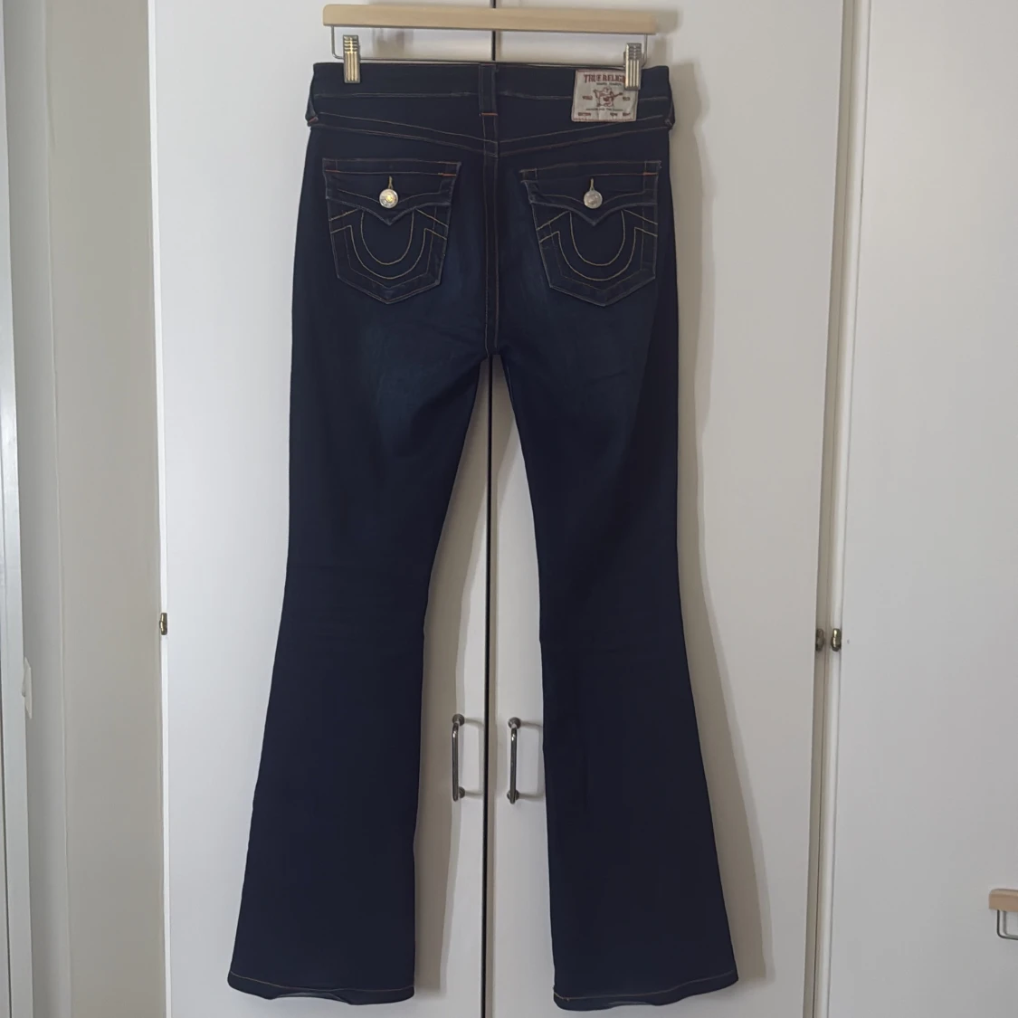 Snygga mörkblå true religon jeans i modellen Becca med bootcut-modell som sitter tajt upptill och släpper ut vid benen. Klassisk femficksdesign och midja som sitter perfekt. Perfekta för dig som gillar en tidlös och trendig look. Är upplagda lite (går att sprätta upp det igen) jag är 167 med långa ben så dom sitter perfekt på mig. Har lite slitningar längst ner i kanten men inget som syns.