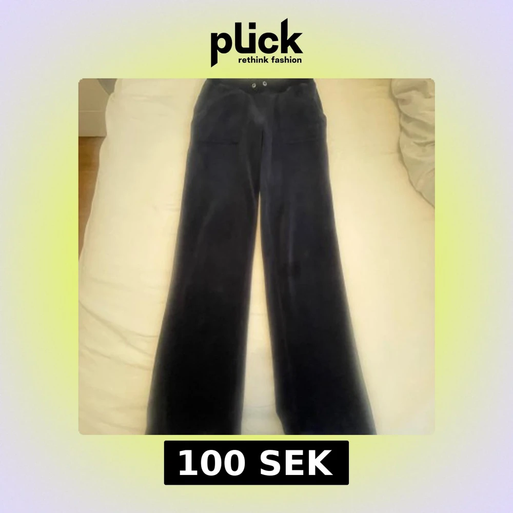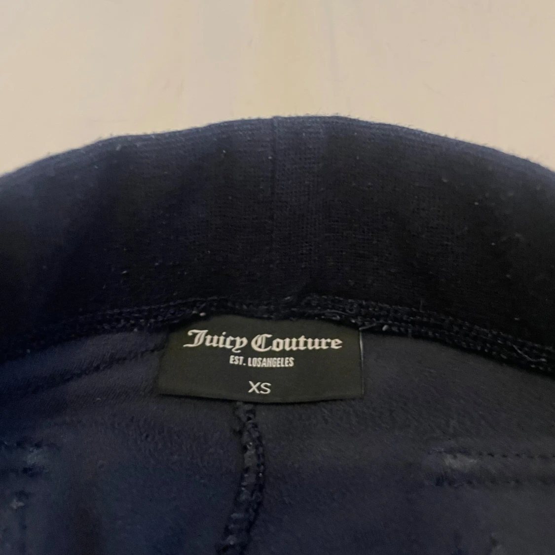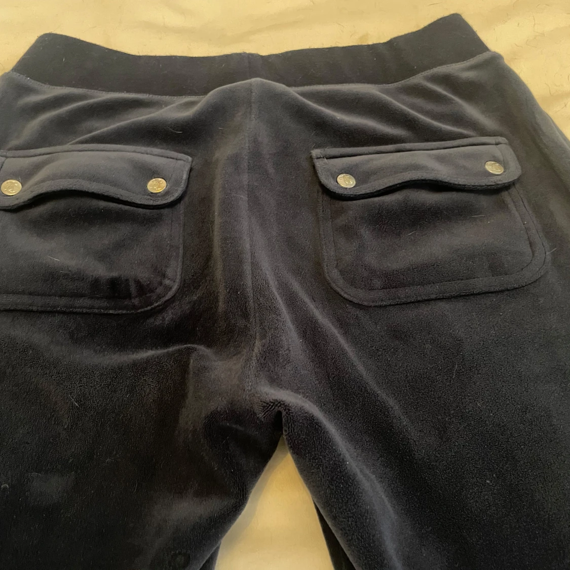 Mörkblåa velourbyxor från Juicy Couture i storlek XS. Byxorna har raka ben, resår i midjan med dragsko och två fickor med lock och knappar bak. Perfekta för en avslappnad och trendig look.Snöret finns men är inte isatt – går att fixa. Därav lägre pris