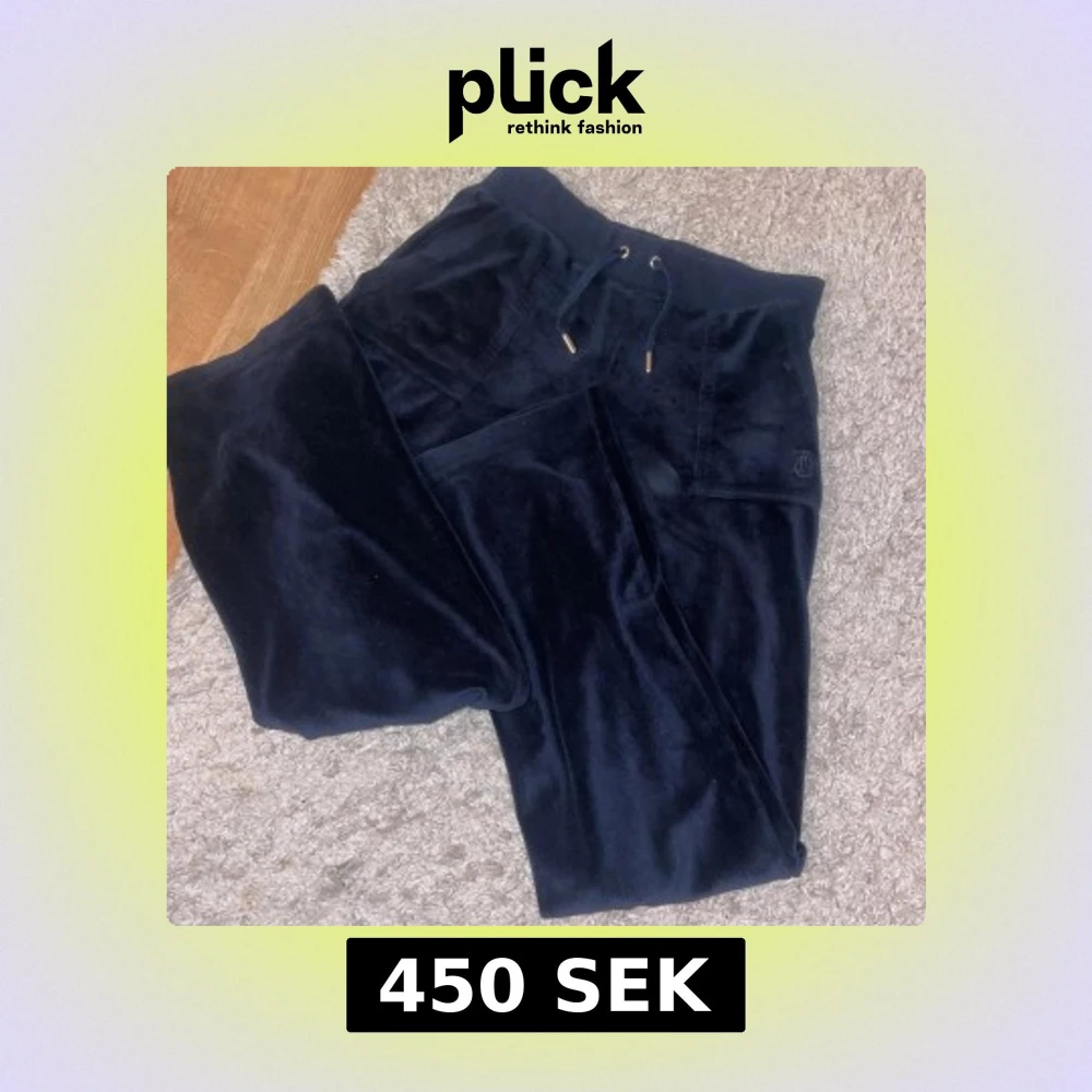 mörkblå velourbyxor från Juicy Couture med elastisk midja och snörning. Byxorna har två bakfickor med knappar och broderad logga på sidan. Använd fåtal gånger så dem är i väldigt bra skick 🟥pris kan diskuteras🟥 skriv om ni vill ha flera bilder