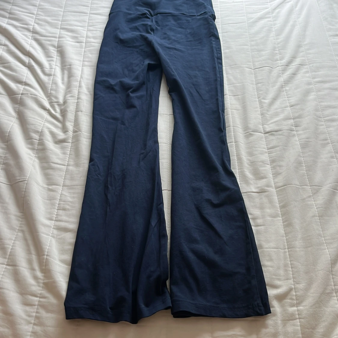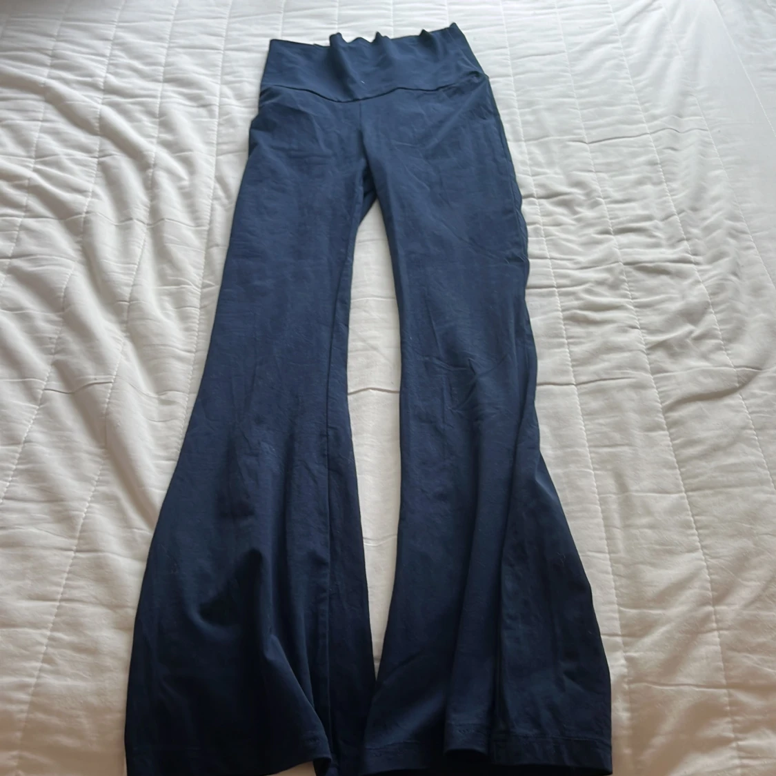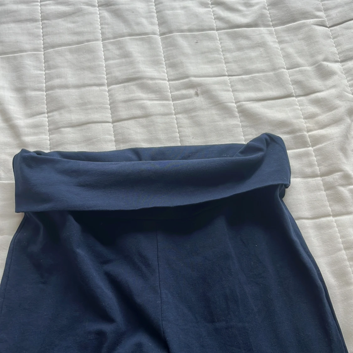 Mörkblå byxor från RYVLS med hög midja och extra vida ben. Byxorna har en mjuk och stretchig känsla, perfekt för en avslappnad och trendig stil. Snyggt vikt linning upptill för en cool detalj.