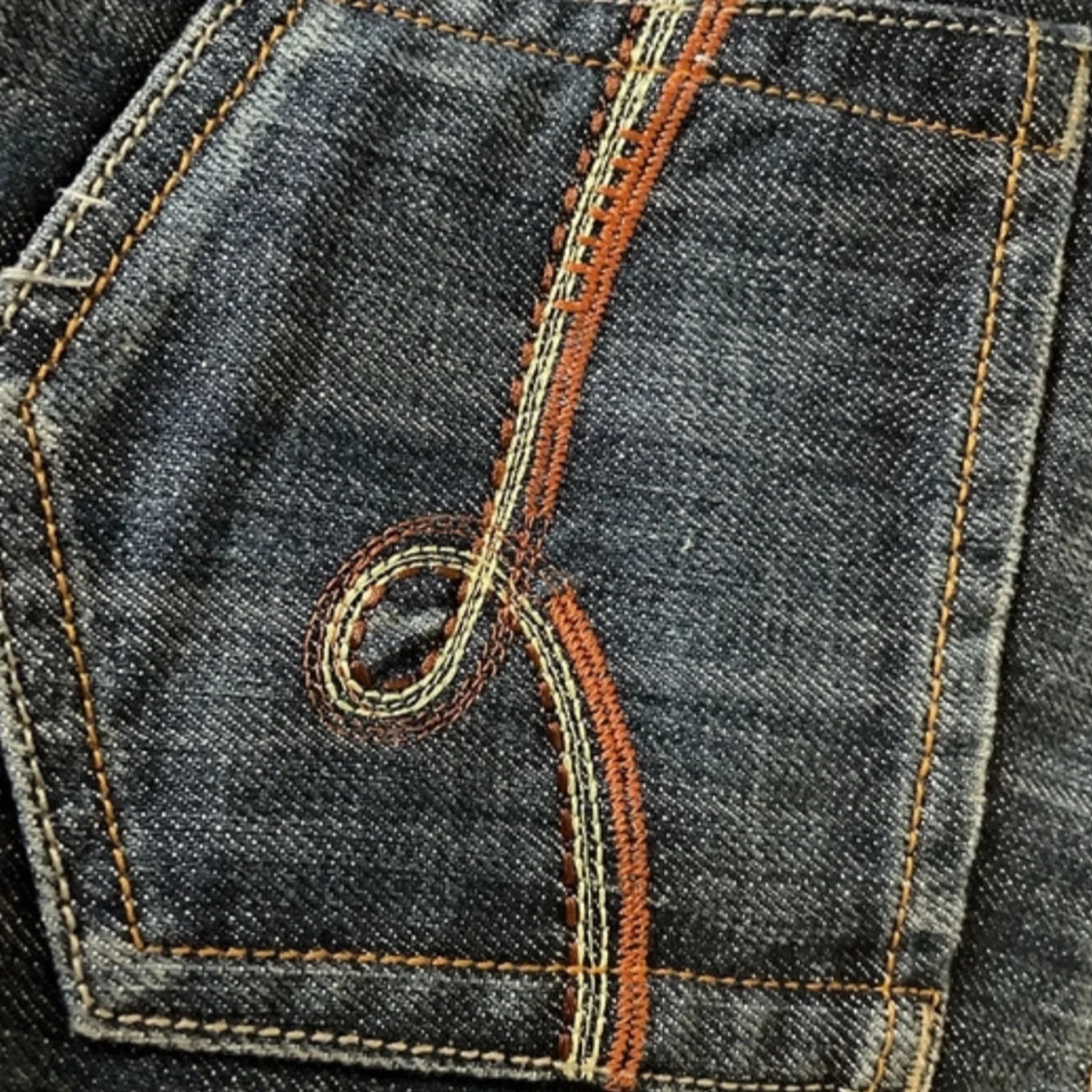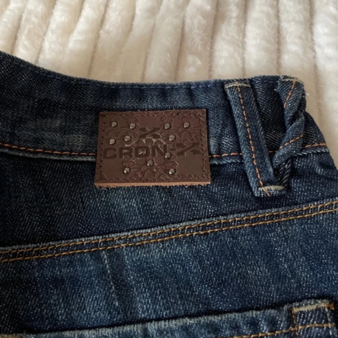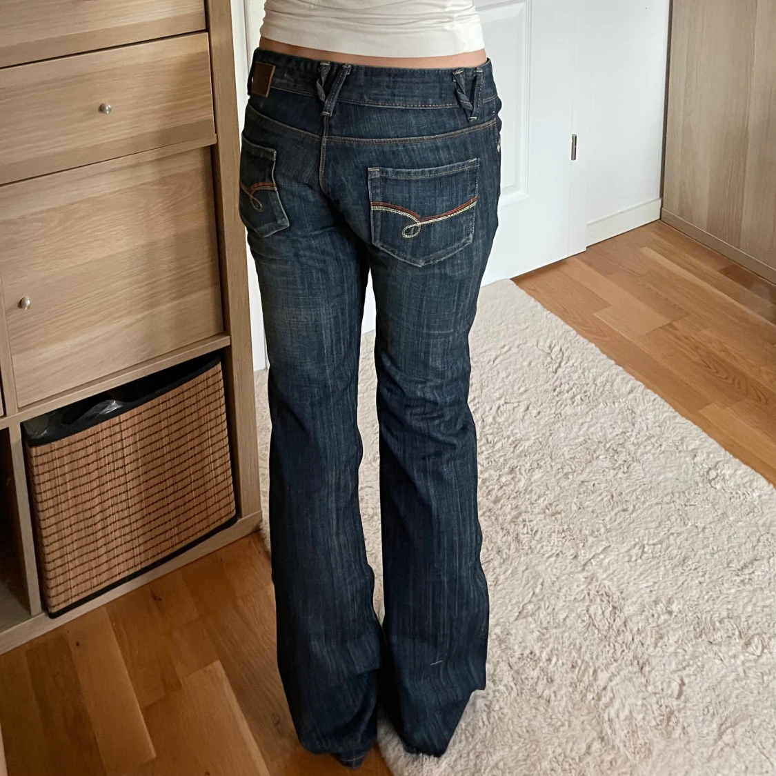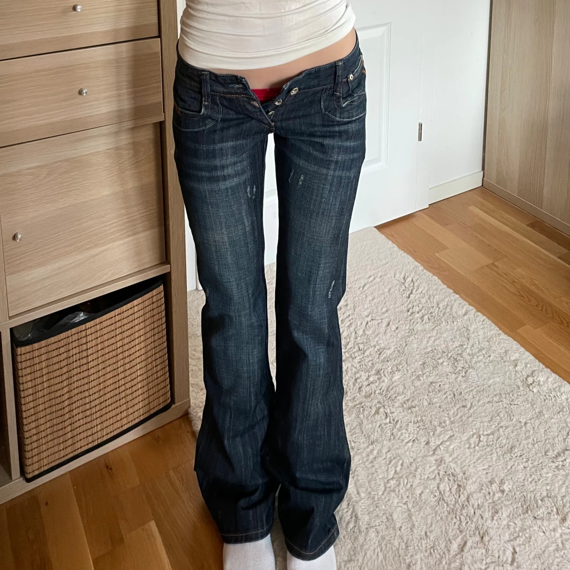 Jätte coola mörkblå lågmidjade utsvängda jeans som är helt oanvända, strl mellan S/XS // midja 36cm tvärsöver, innerbenslängd 86cm