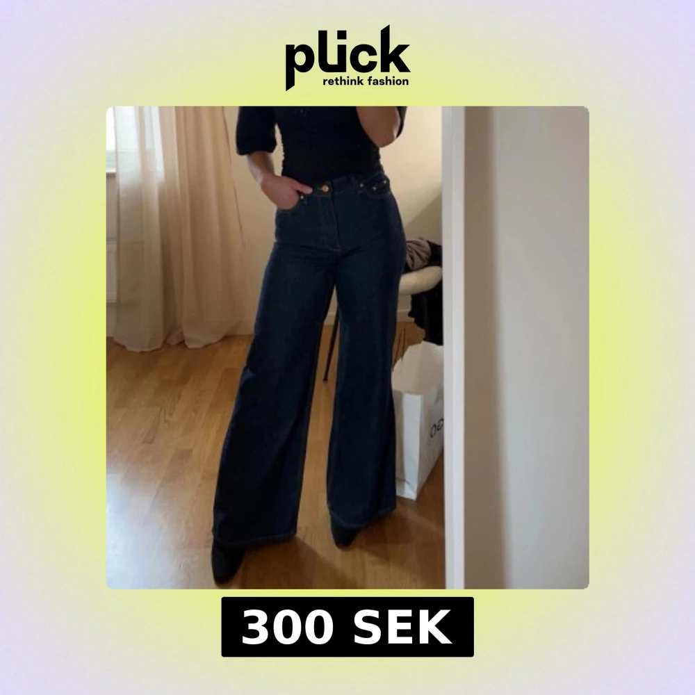 Säljer ett par mörkblå jeans med hög midja och vida ben. Klassisk femficksmodell med knapp och dragkedja framtill. Perfekta för en trendig och avslappnad look. Aldrig använda.