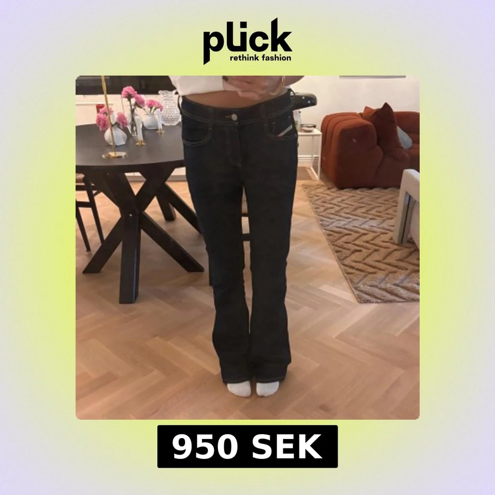 Säljer ett par svarta jeans från Diesel med bootcut-modell och kontrastsömmar. Jeansen har fem fickor, låg midja och passar storlek 36/38. Perfekta för dig som är lång.