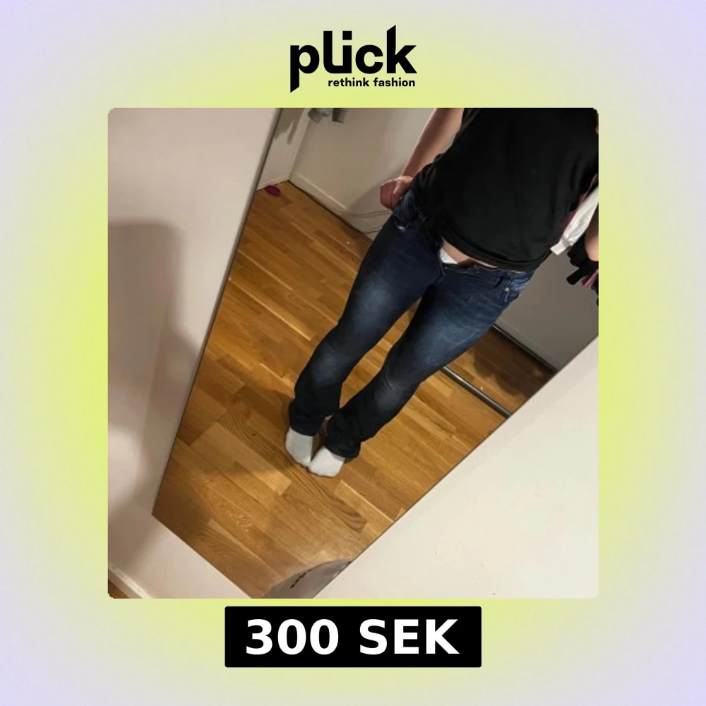 Säljer ett par lågmidjade mörkblåa jeans som är tonade och har fina detaljer. De är i mycket bra skick och har inte kunnat använda dem pågrund av att de är för små på mig. Innerbenlängd: 84 cm & runt midjan: 75 cm 💗
