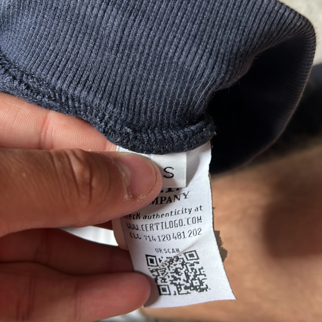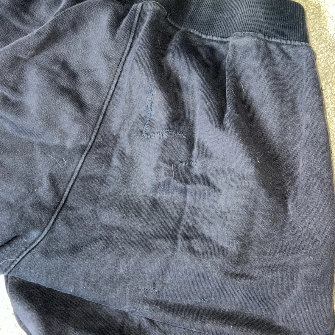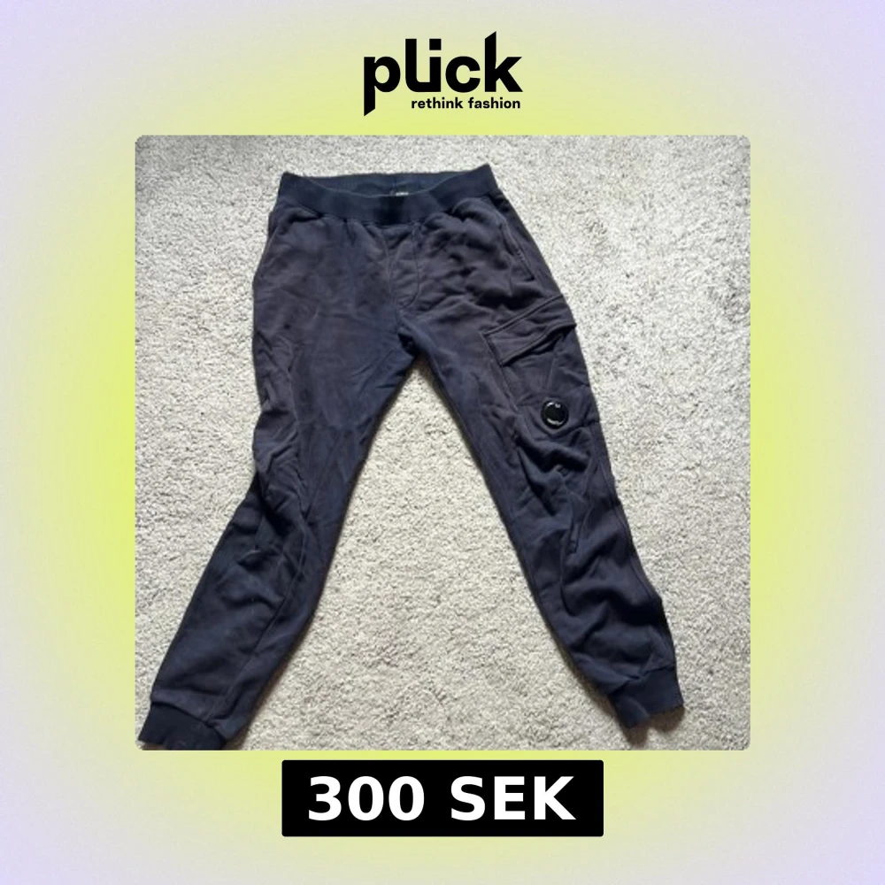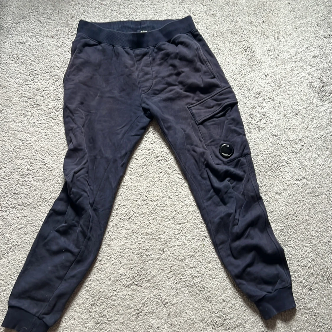 Säljer ett par mörkblåa mjukisbyxor från C.P. Company med resår i midjan och muddar vid bensluten. Byxorna har en stor cargoficka på benet med den klassiska C.P. Company-loggan. Perfekta för en avslappnad stil. De är sydda i rumpan därmed lite sämre skick och billigare pris.