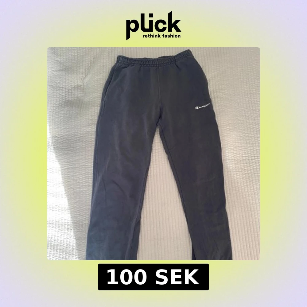 Säljer ett par mörblåa mjukisbyxor från Champion med elastisk midja och muddar vid bensluten. Byxorna har en broderad Champion-logga på benet. Perfekta för en avslappnad stil. Säljer för 100 kr + frakt