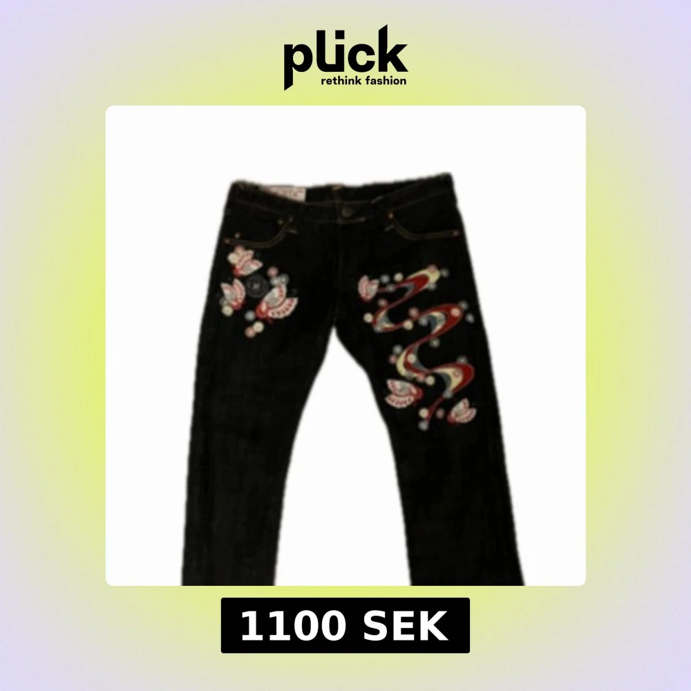 Unika mörkblåa jeans från Evisu med färgglada broderade fjärilar och blommor i rött, vitt, blått och gult. Snygga detaljer längs benen och framfickan, klassisk femficksmodell och kontrastsömmar. Perfekt för dig som vill sticka ut med coola mönster och streetstyle. Tveka inte på att höra av er vid frågor!