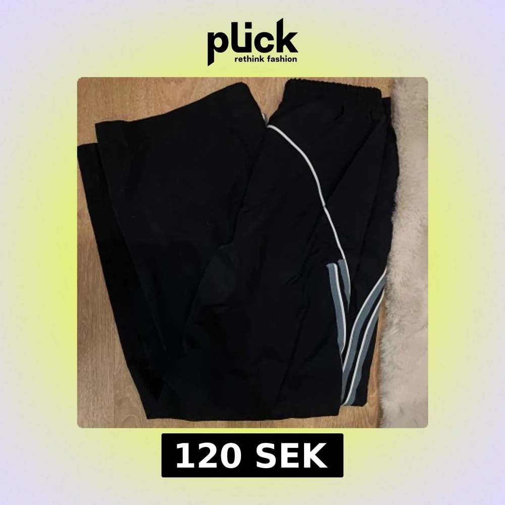Snygga mörkblåa träningsbyxor med vitblåa ränder längs sidorna och elastisk midja. Liknar parachute pants. Står inget märke eller storlek men skulle säga dem är storlek S/M. Köpt på plick men har aldrig använt.