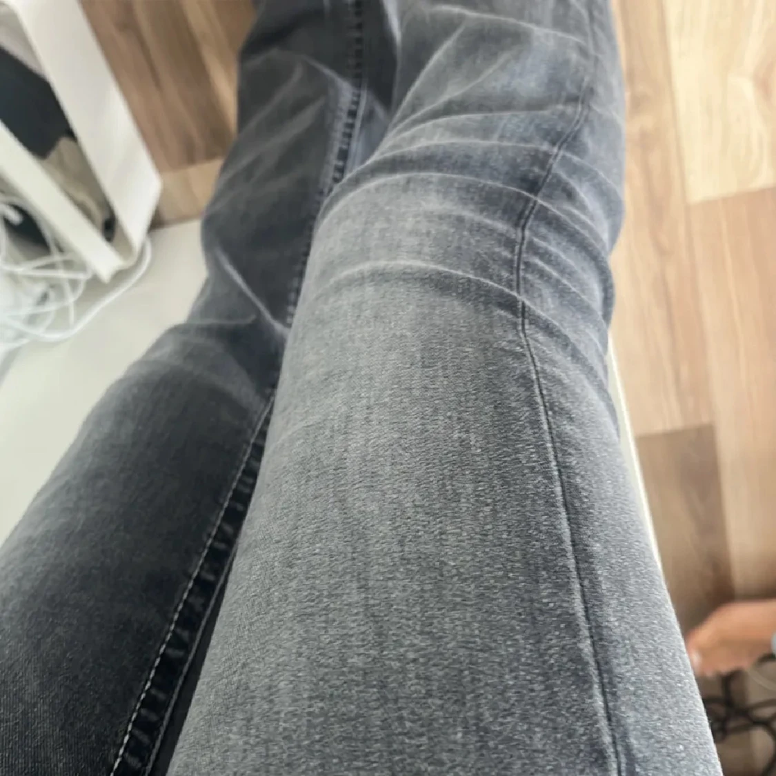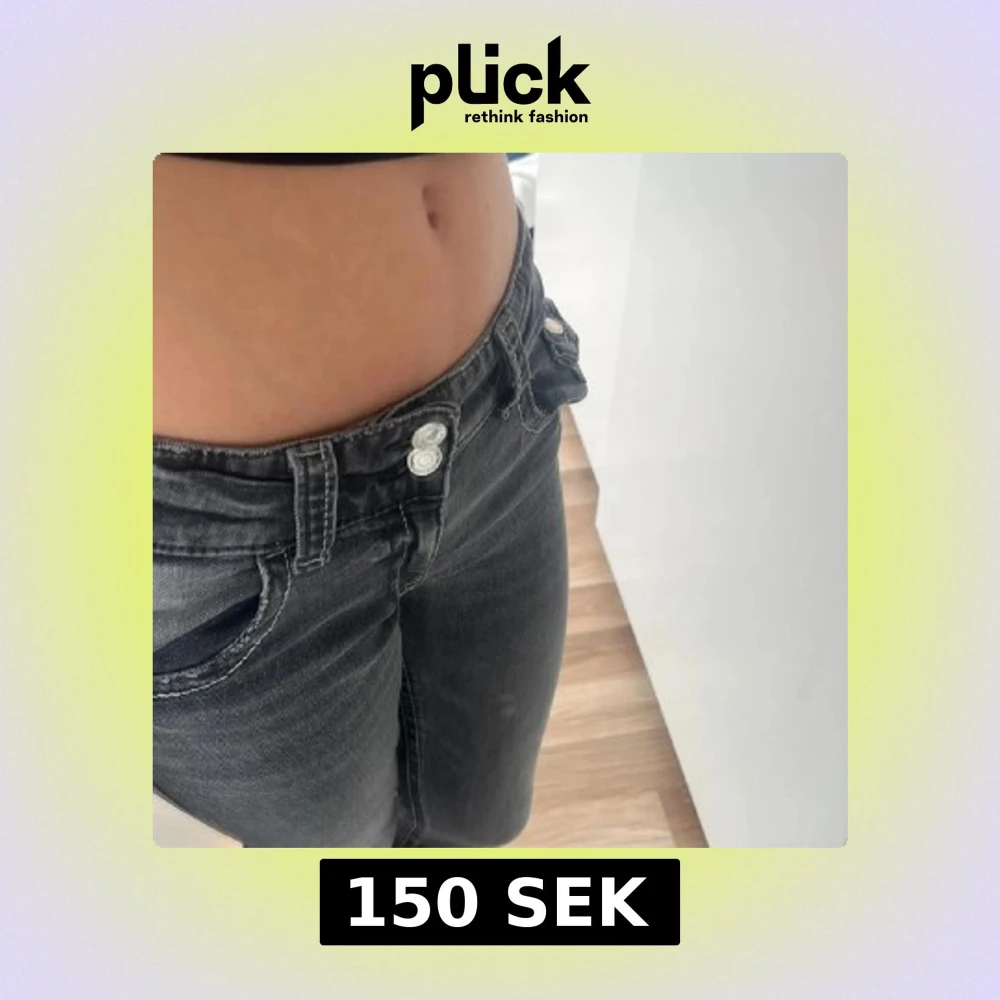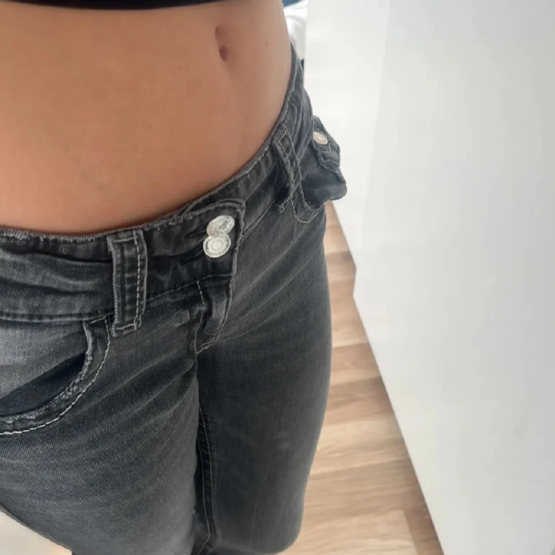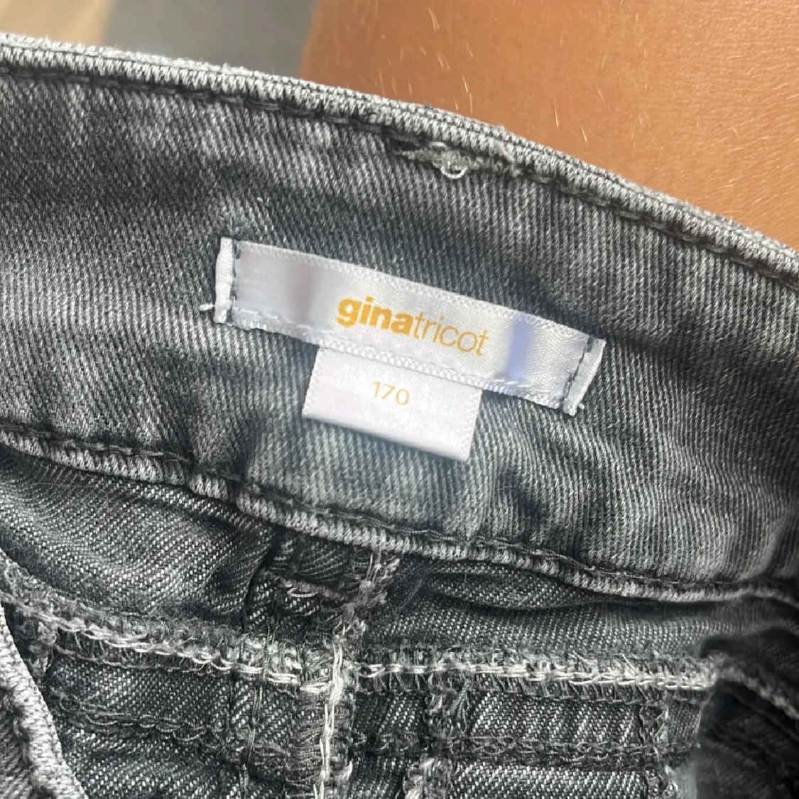 Snygga mörkgrå jeans från Gina Tricot i storlek 170. Modellen har bootcut-ben och låg midja, med klassiska fem fickor och dubbla knappar fram. Jeansen är gjorda i mjukt denim och har en cool tvättad look som passar till allt.