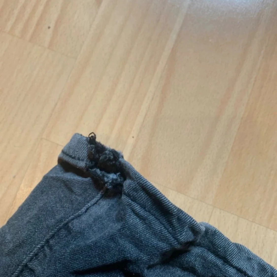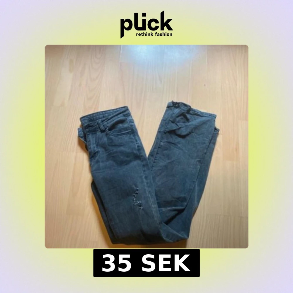 Säljer ett par mörkgrå jeans med coola slitningar vid knäet. De har några skavanker, en längst ner där de blivit slitna och sen har det gått sönder där man har bältet igenom men inget som märks.