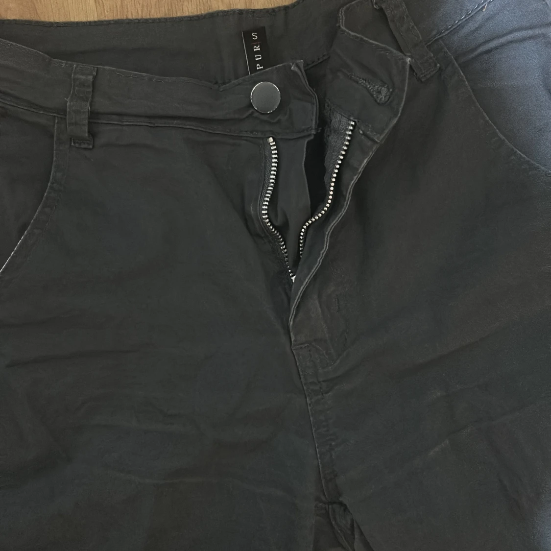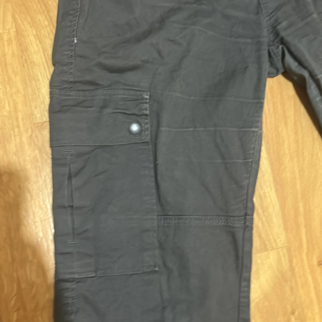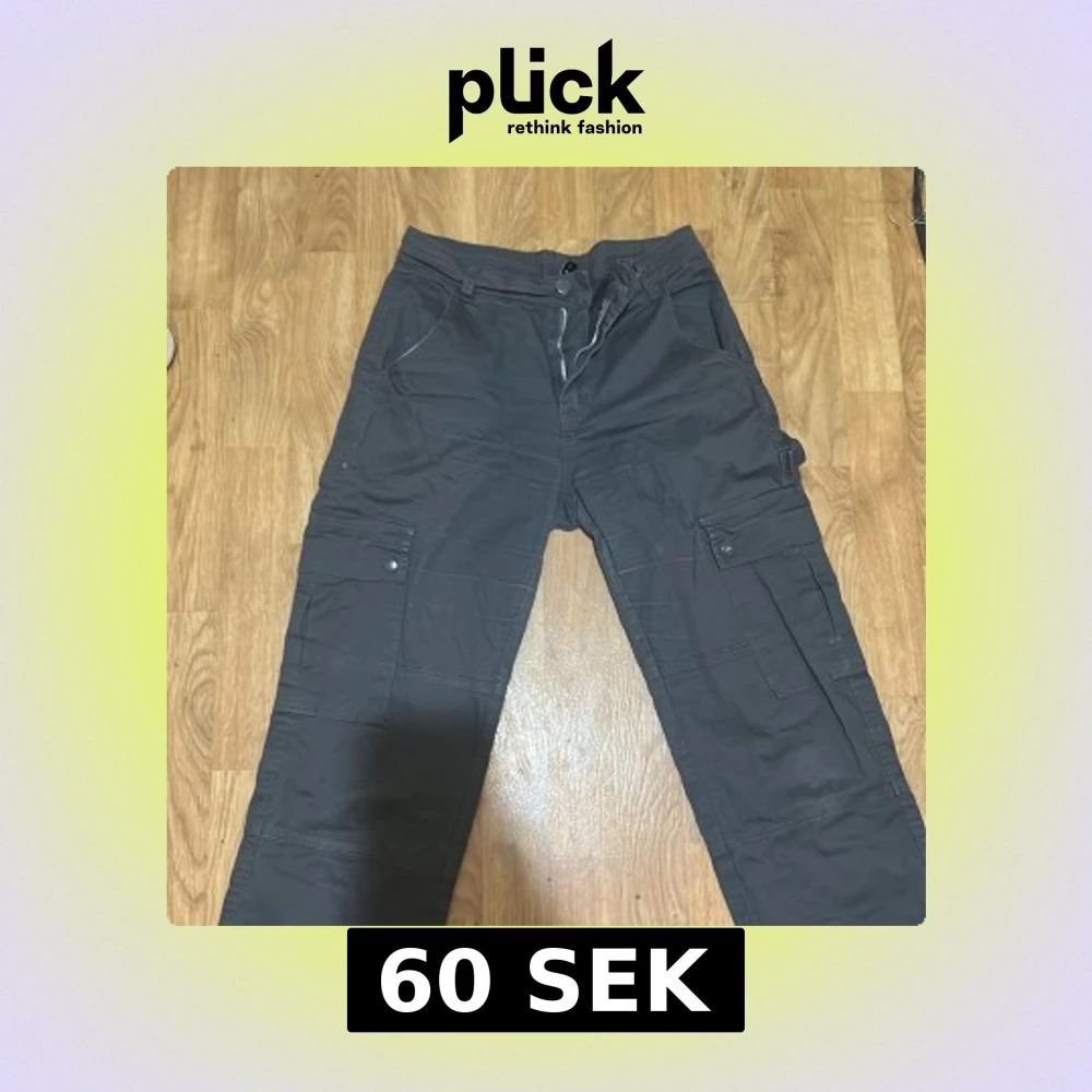Säljer ett par mörkgrå cargopants med flera fickor på benen och klassisk dragkedja framtill. Byxorna har normal passform och är perfekta för en avslappnad stil. Snygga detaljer med knappar på fickorna och bälteshällor i midjan.