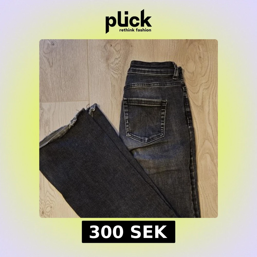 Snygga mörkgrå jeans från ONLY med fransad kant nertill. Lågmidjade, bootcut jeans med slits nertill. Storlek 32