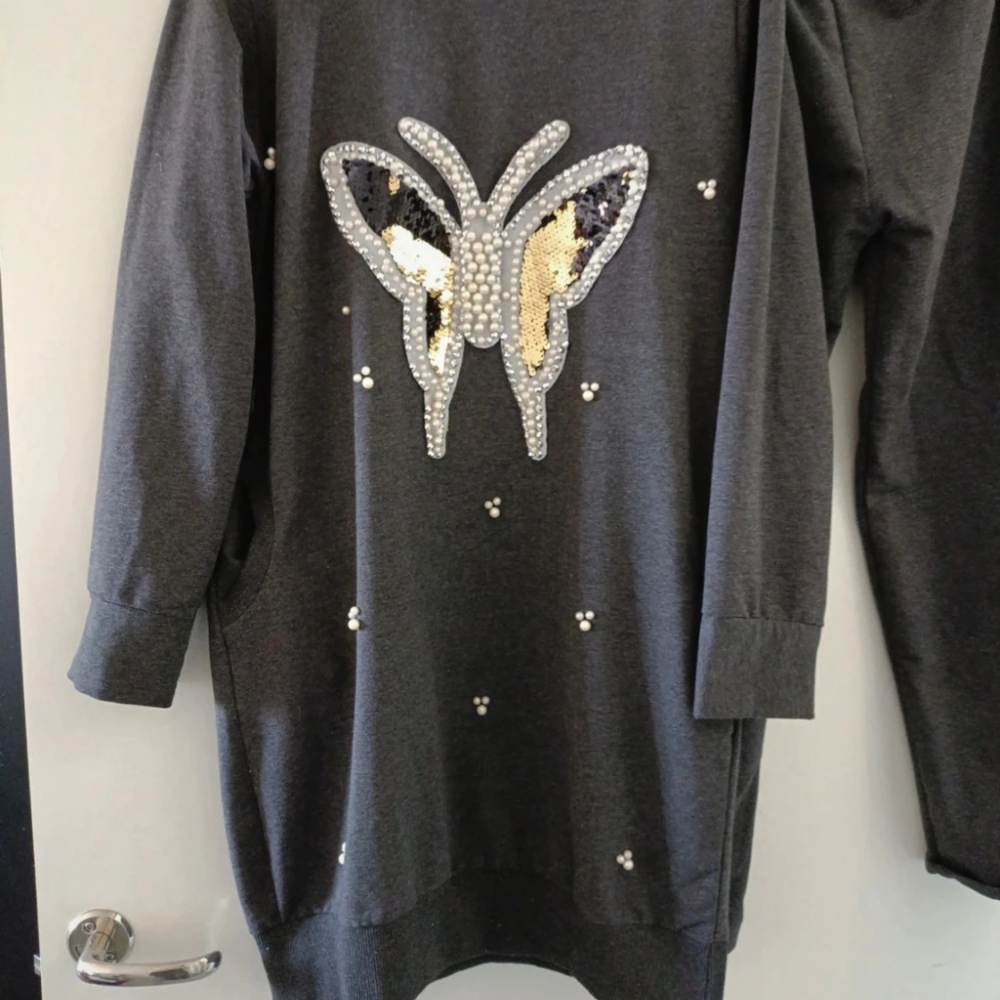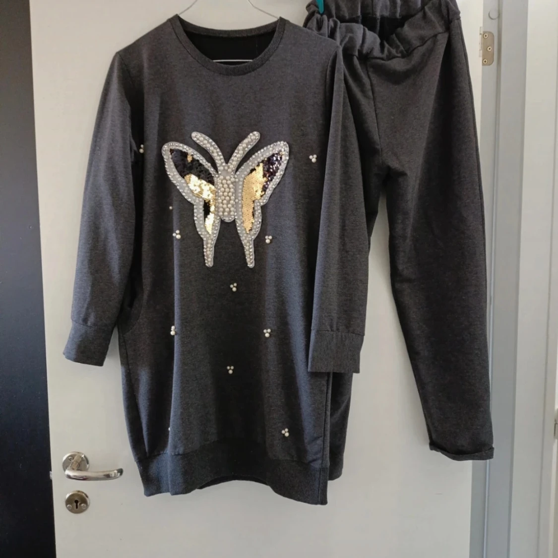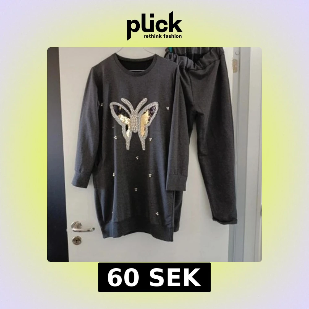 Mörkgrå mjukisbyxor med resår i midjan, tillverkade i mjukt material. Perfekta för chill dagar och matchar toppen med fjärilspaljetter. Byxorna har en avslappnad passform och är riktigt bekväma.
