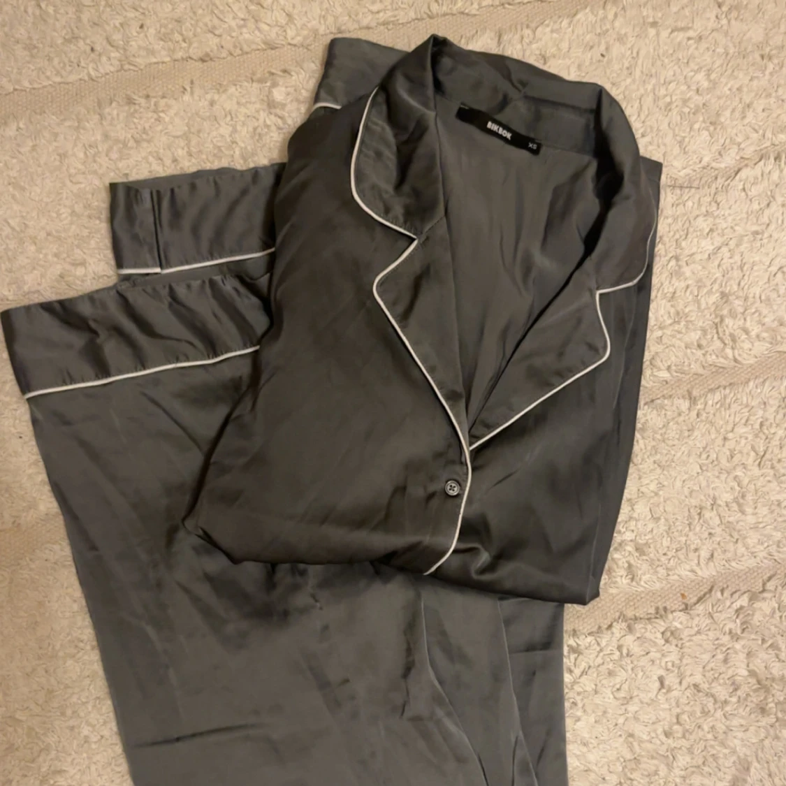 Säljer ett par mörkgrå pyjamasbyxor från Bik Bok i satin medkontrastsömmar längs kanterna. Säljer för att jag har en liknande i ljusrosa ❤️