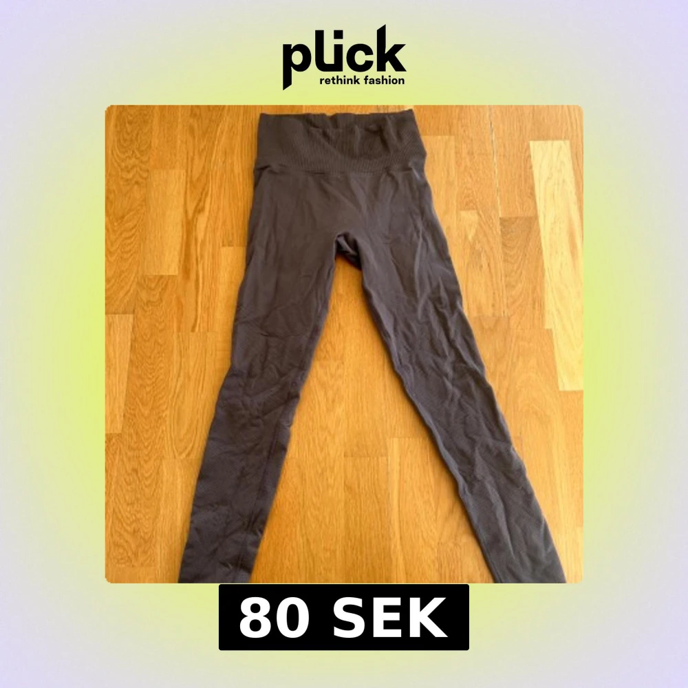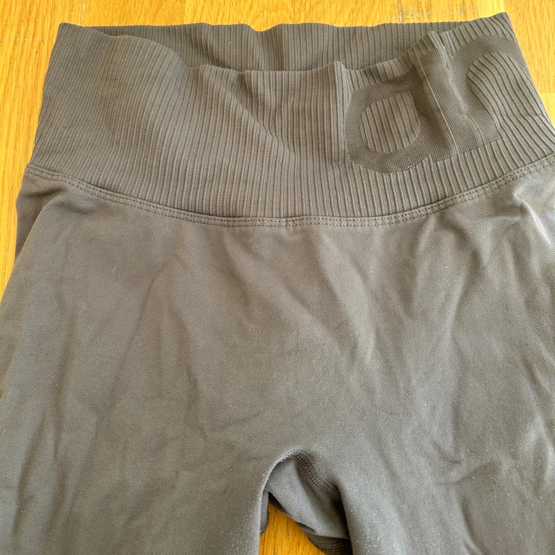 Säljer ett par mörkgrå seamless leggings med hög midja och ribbad linning. De är i från AIM’N