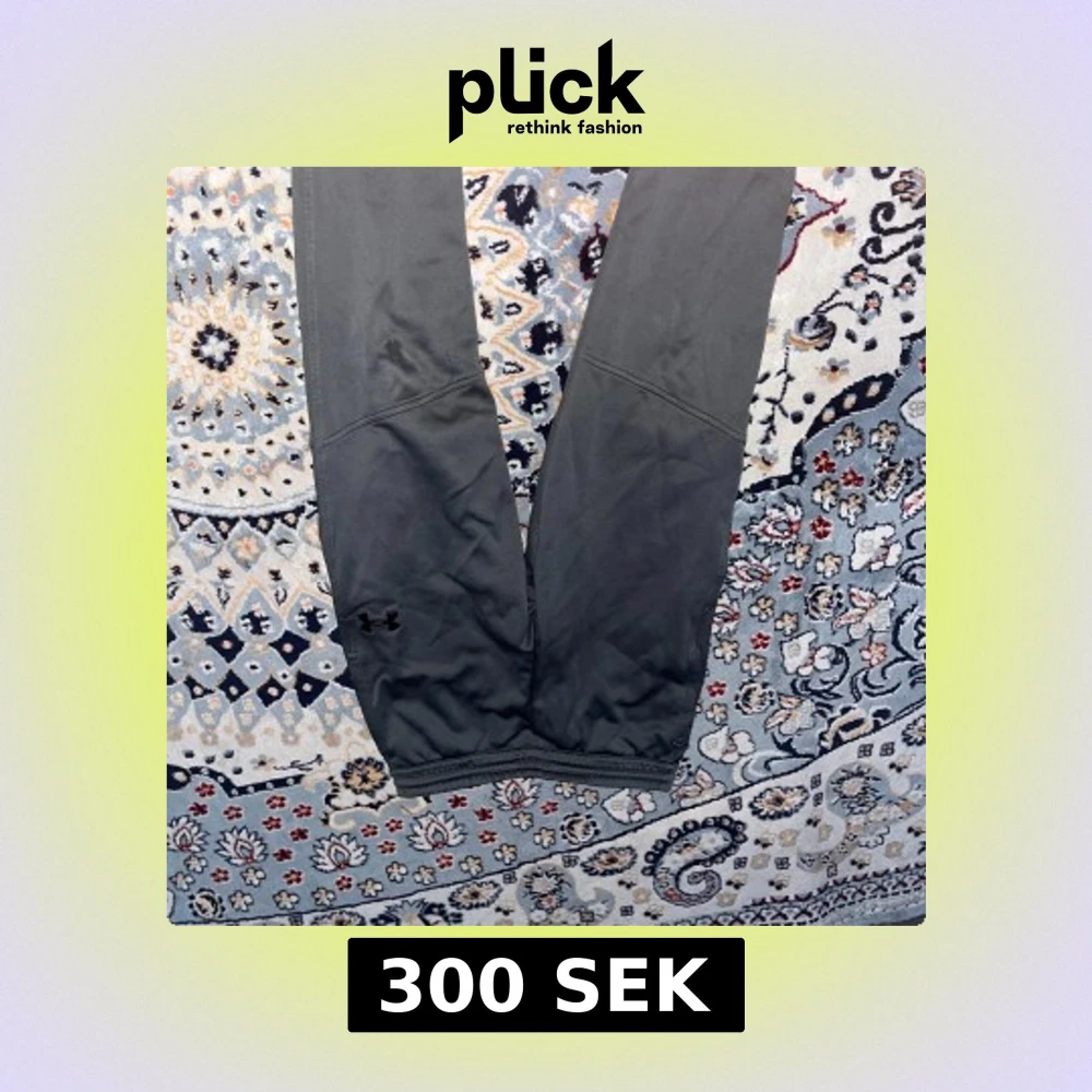 Säljer ett par mörkgrå träningstights från Under Armour med logga på benet. De har bred resår i midjan med tryckt mönster och är tillverkade i ett stretchigt syntetmaterial som passar perfekt för träning.