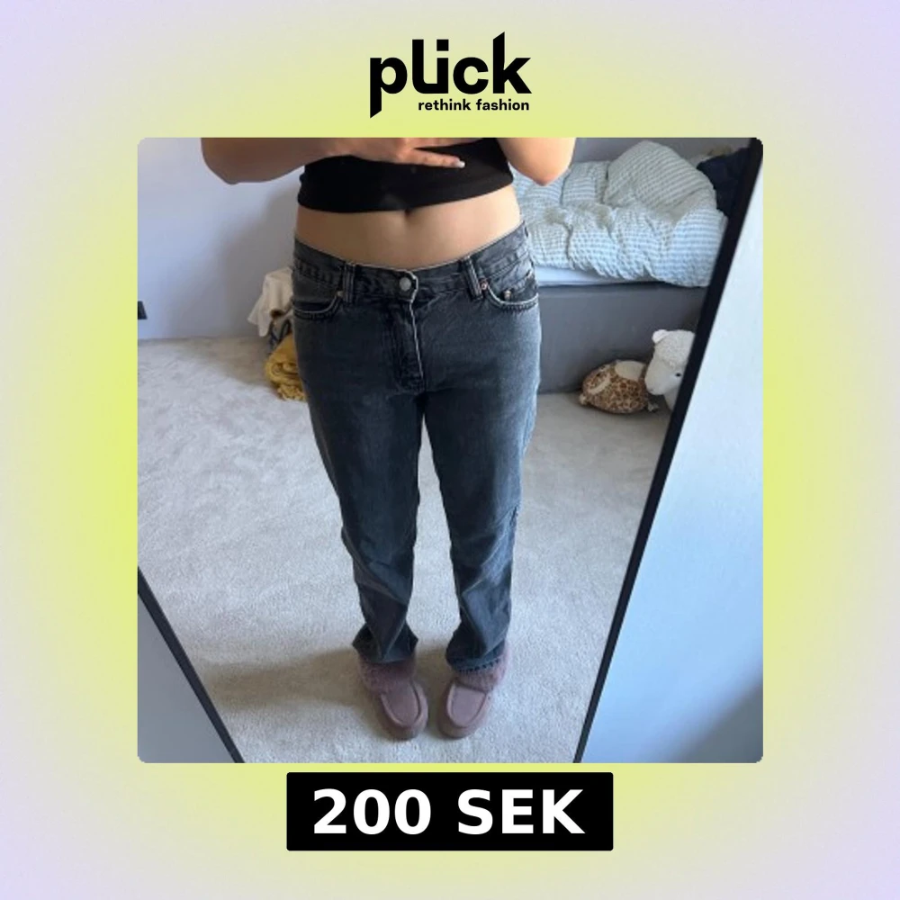 Säljer ett par jeans i mörk grå tvättad denim. Jeansen har rak passform, normal midja och femficksdesign. Perfekta för dig som gillar en tidlös och avslappnad look. Materialet är 100% bomull och de har metallknappar. Jg tycker om dom väldigt mycket men jag säljer pågrund av att jag har för mycket jeans hemma.