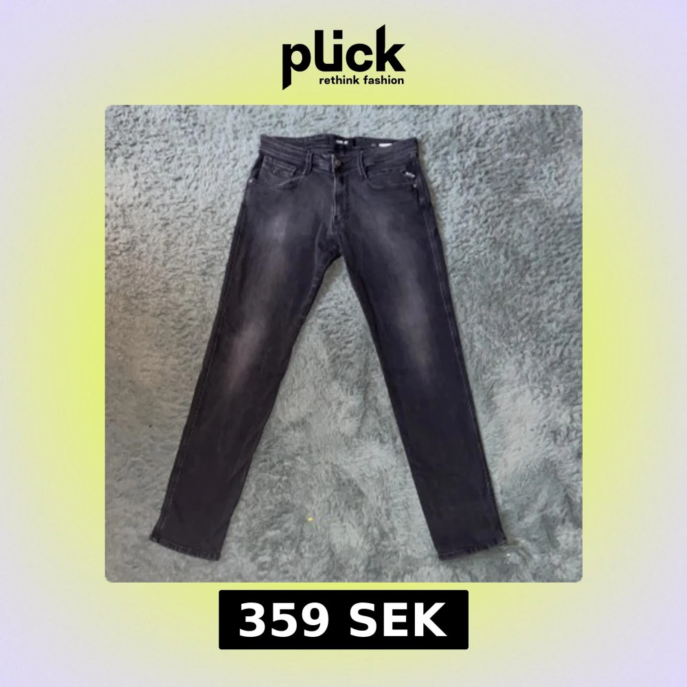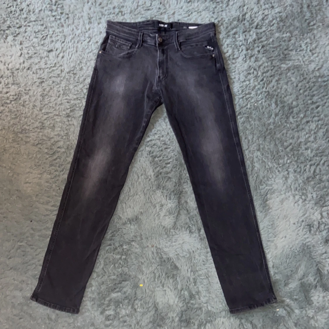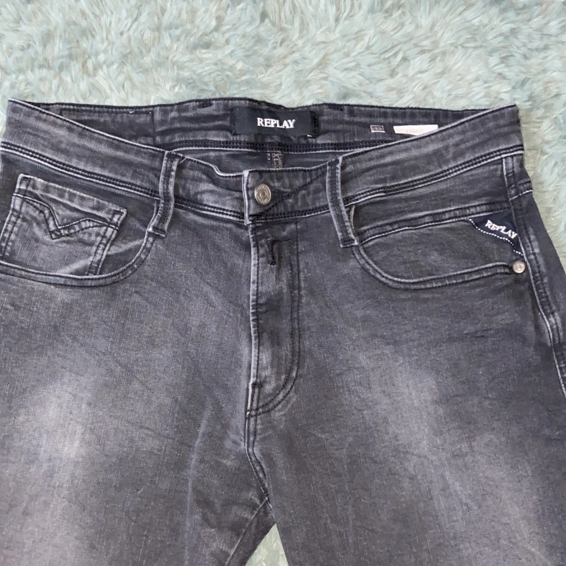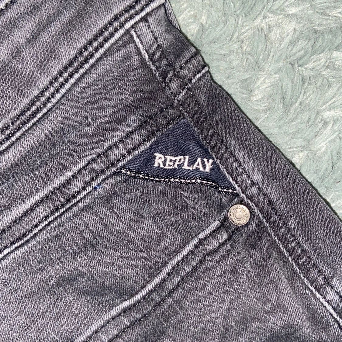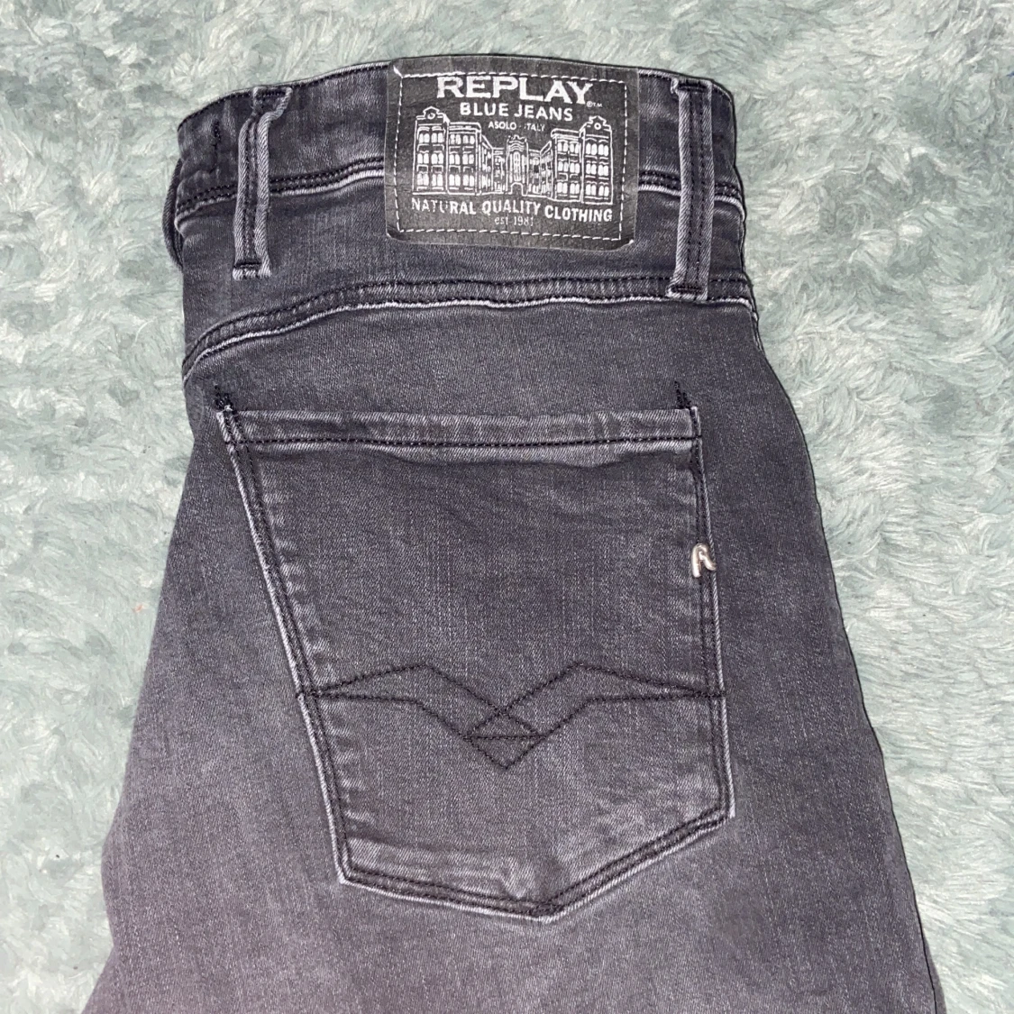 Säljer ett par mörkgråa/svarta Replay jeans med diskret tvättad look. Storlek 33/32. Klassisk femficksmodell med dragkedja och knapp framtill. Byxorna har raka ben och tydliga sömmar, samt Replay-logga på fickan och bak på linningen.