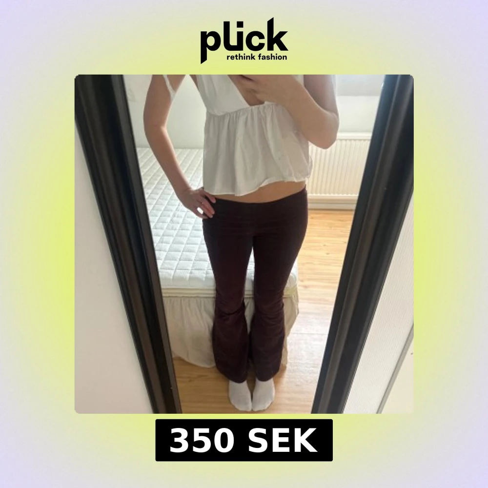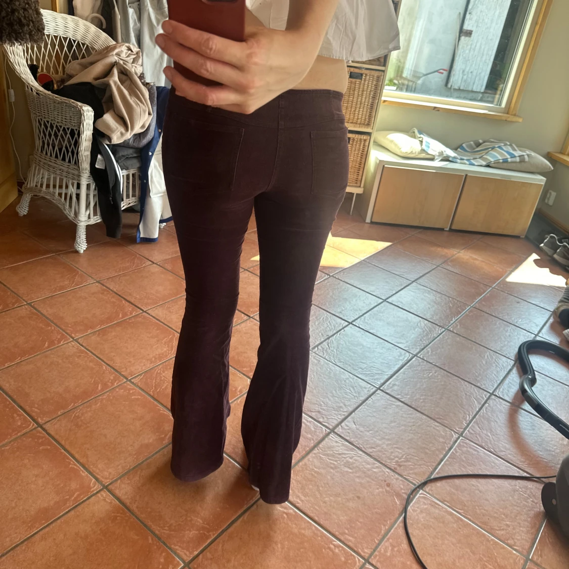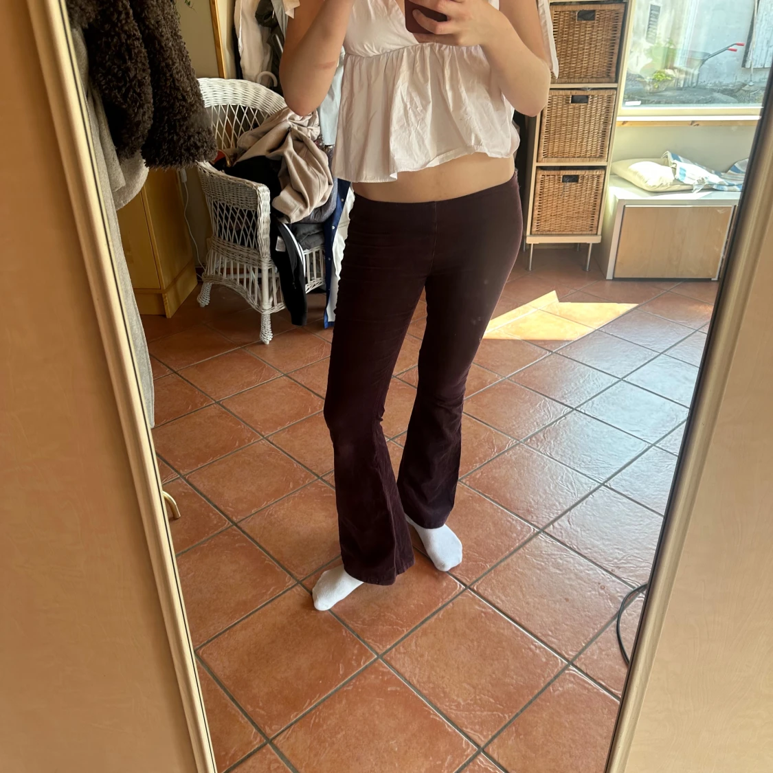 Säljer ett par mörkbruna manchesterbyxor med bootcut och låg midja. Byxorna har klassisk femficksdesign och är i ett mjukt, stretchigt manchestertyg. Säljer då jag är väldigt lång och dem är för korta. S-M