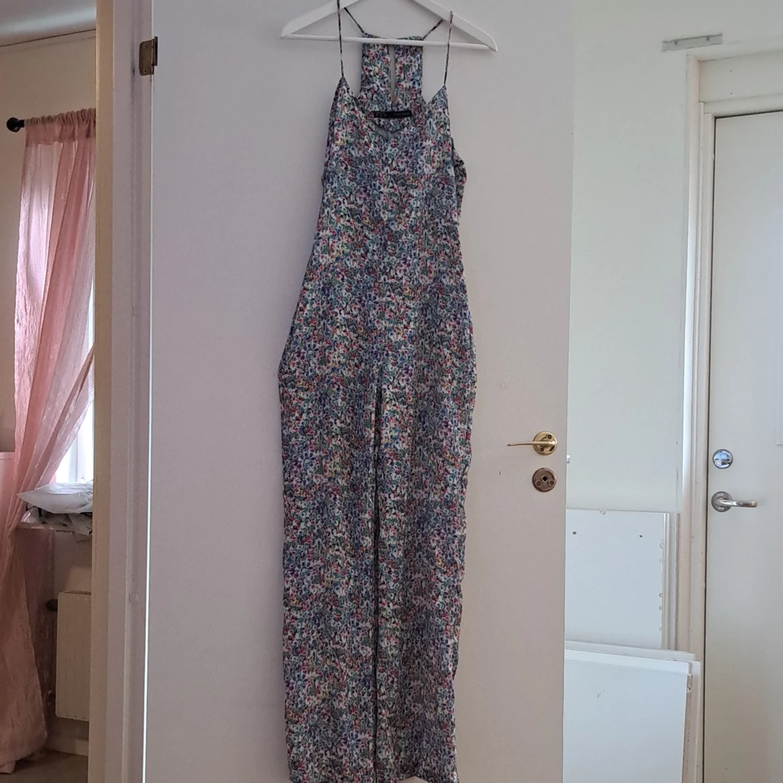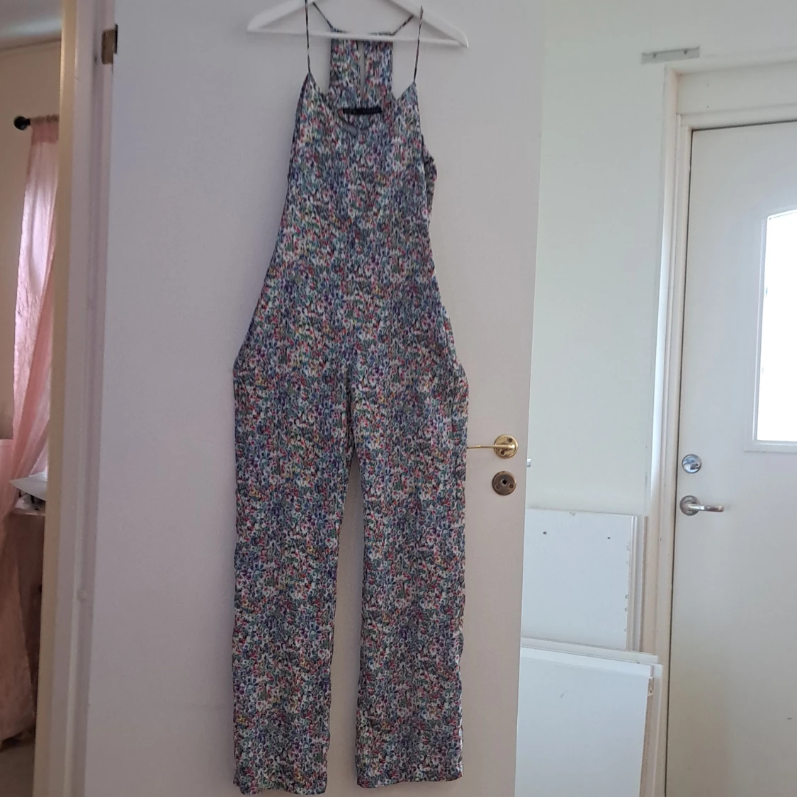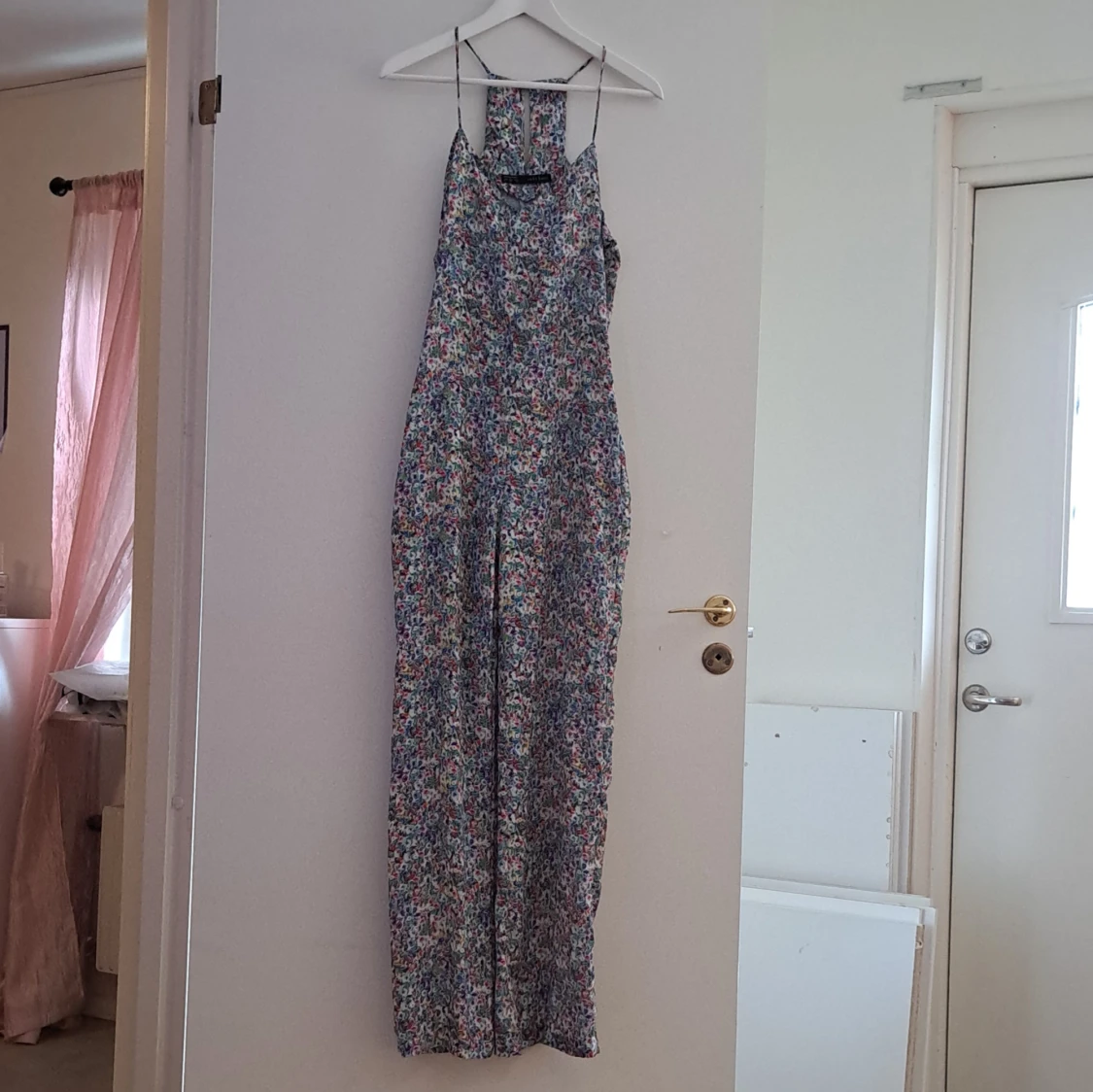 Säljer en superfin blommig jumpsuit med smala axelband. Perfekt för sommardagar eller en avslappnad fest. Det har en lös passform och är gjord i ett lätt och bekvämt material. Den har ett färgglatt mönster som verkligen sticker ut!