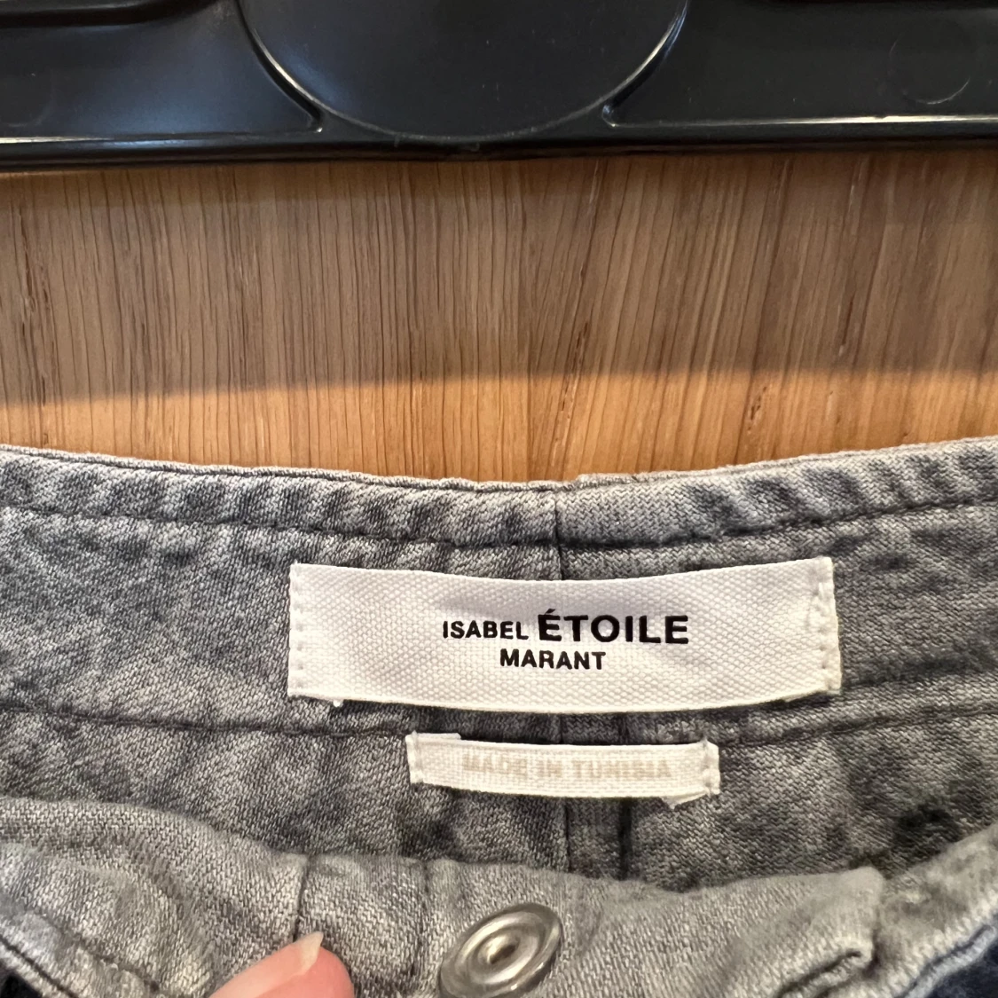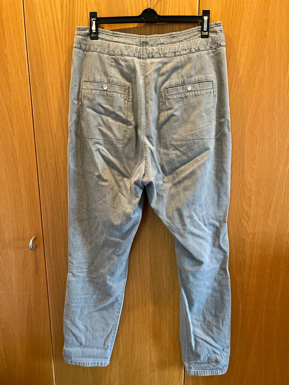 Snygga grå jeans med dragsko i midjan. Stora fickor på rumpan. Mått: midja 44 längd 99. Strl 42.