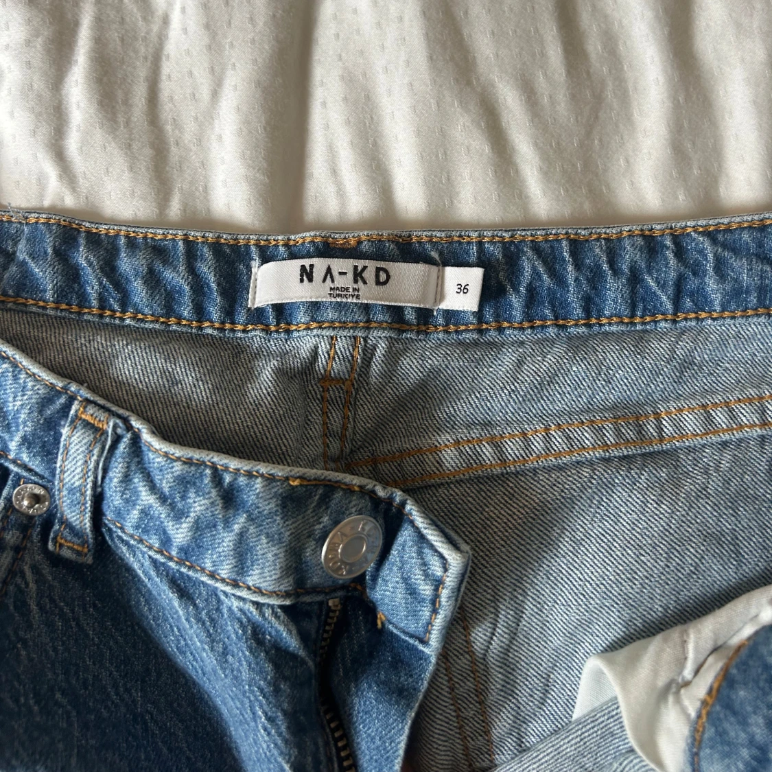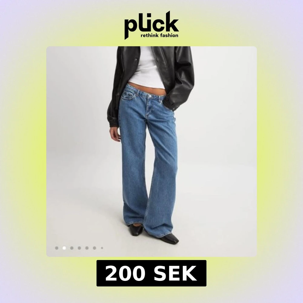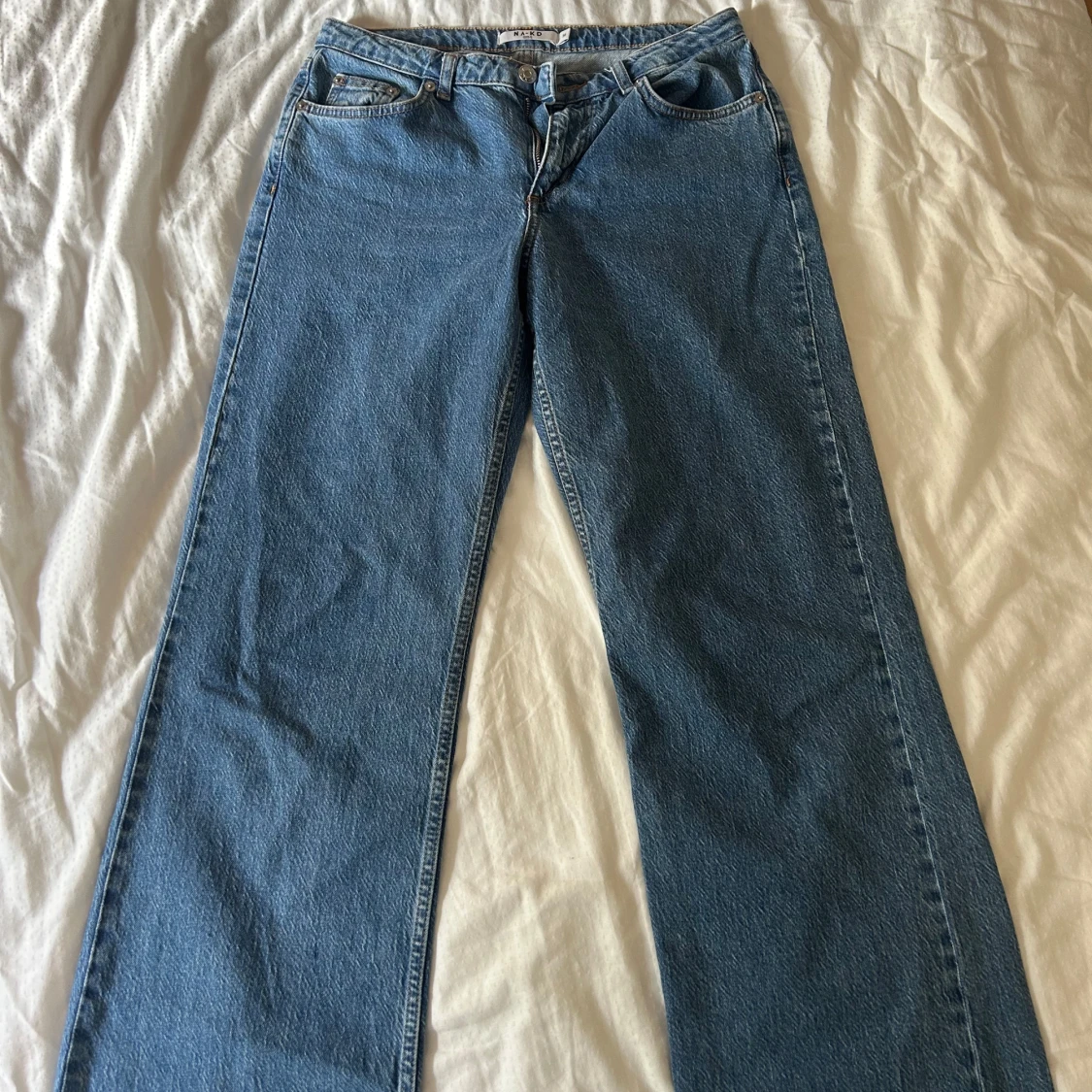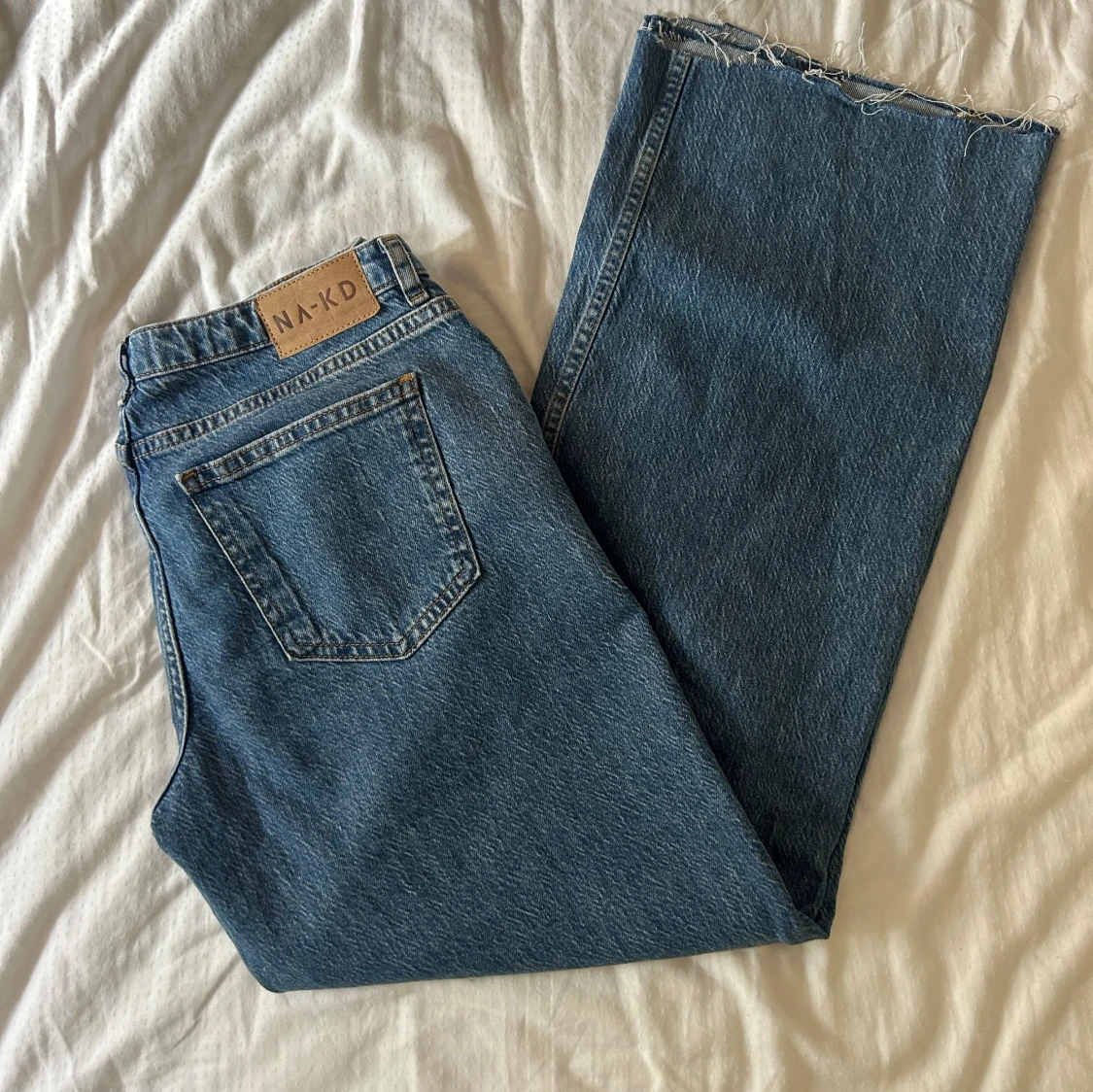 Säljer ett par blå jeans från NA-KD i klassisk denim med wide fit och låg midja. Modellen har raka, vida ben och rå kant nedtill för en cool vibe. Femficksdesign och knapp med dragkedja framtill. Perfekta för dig som gillar avslappnad stil. Är kapade då de var för långa