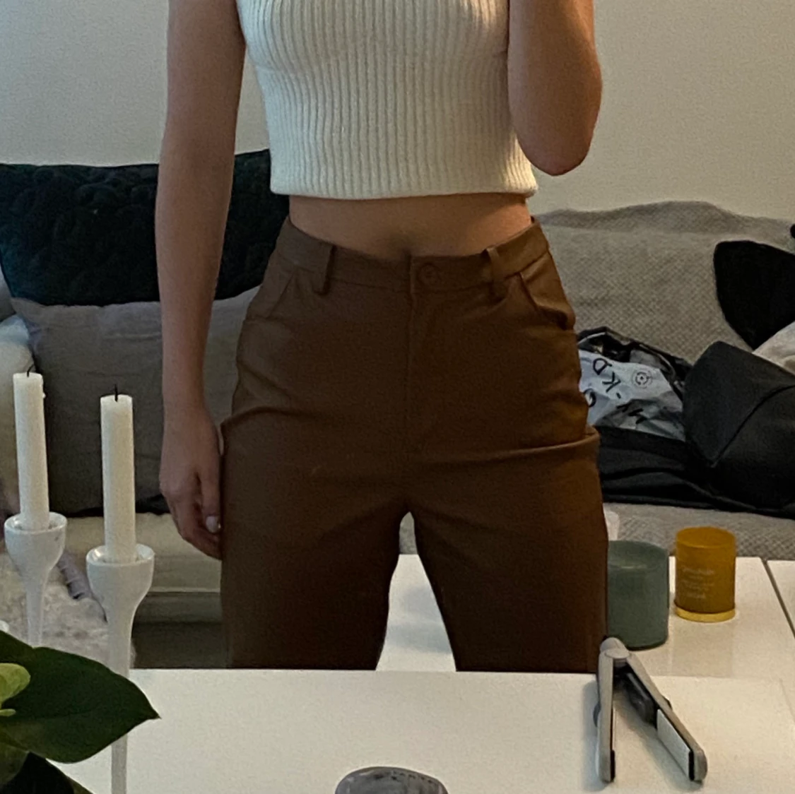 raka bruna skinnbyxor med hög midja. från nakd. sitter tajt runt låten och rumpa och släpper typ precis ovan knäna och faller rakt då.