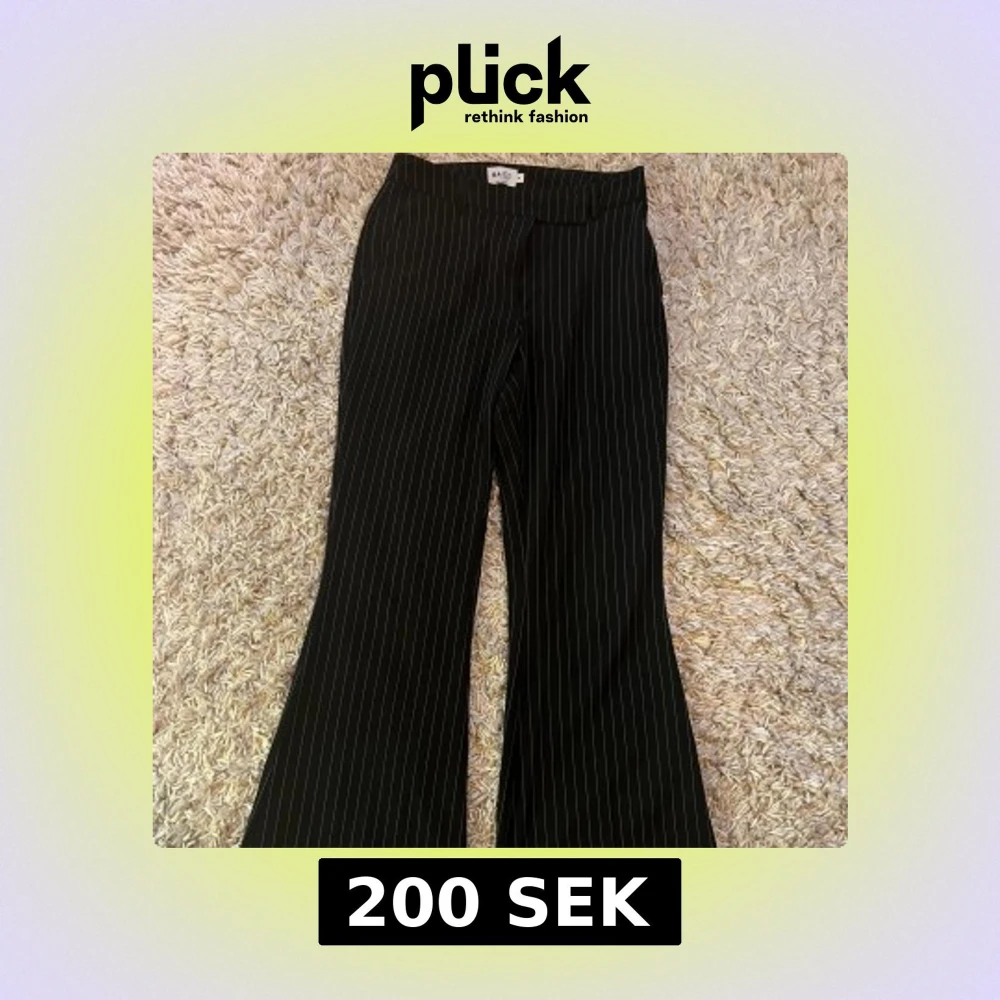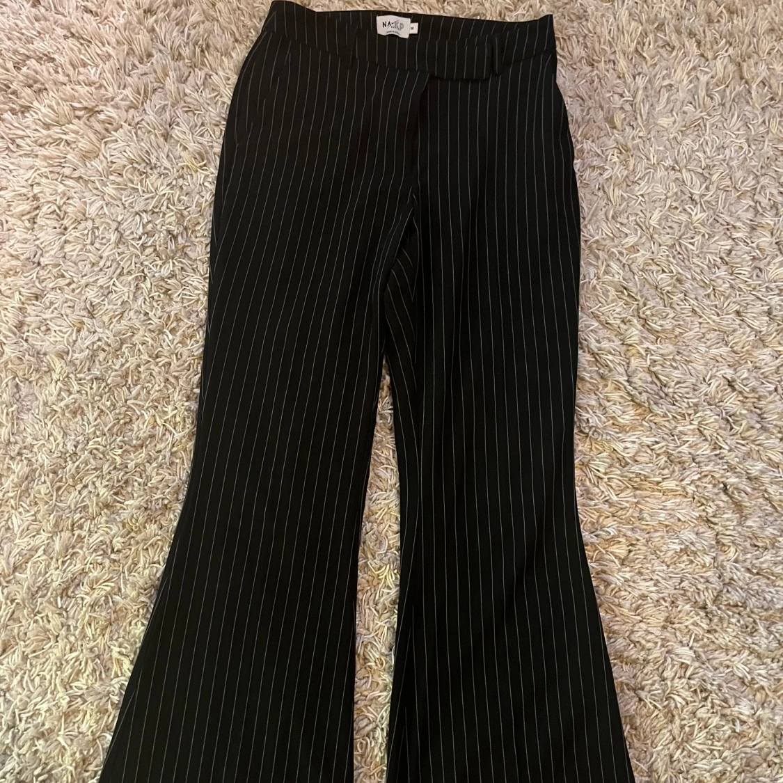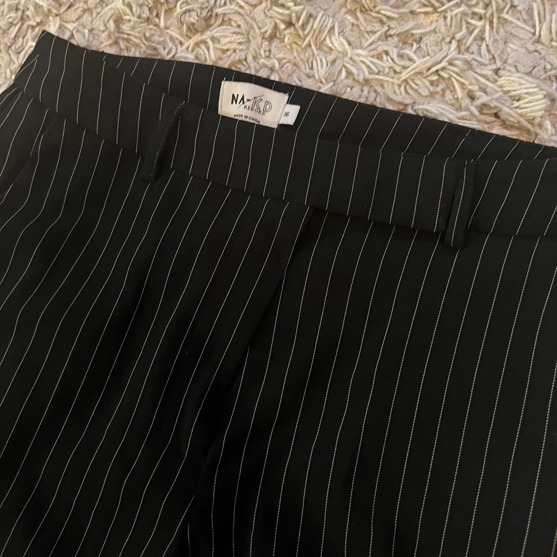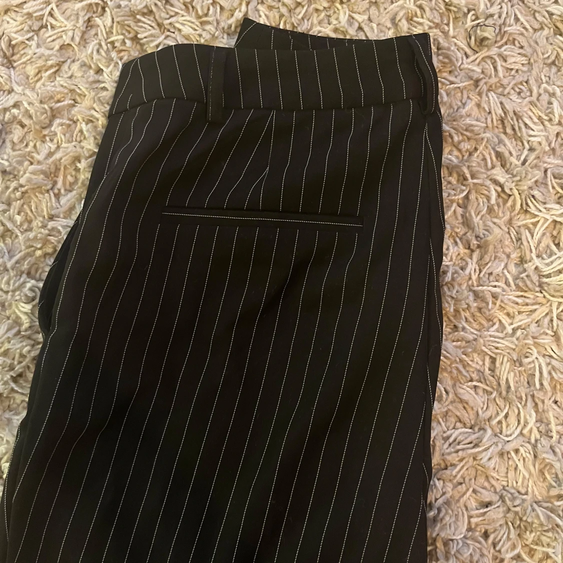 Svarta kostymbyxor med vita ränder, byxorna har utsvängda ben o ”kostym” material. Inte använt dom så mycket för jag växt ut som men jättefina på