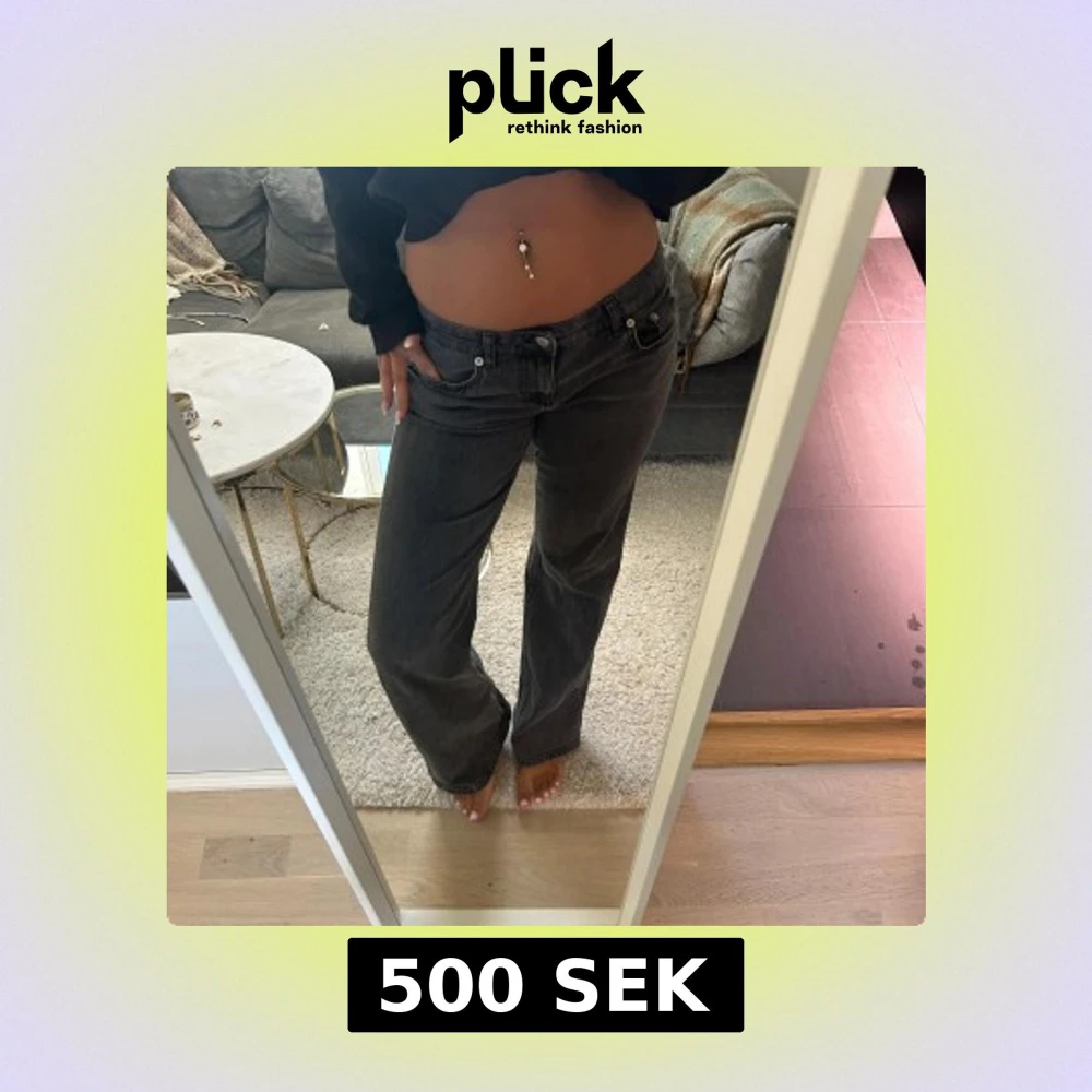 Säljer ett par mörkgrå jeans med låg midja och raka ben. Jeansen har klassisk femficksdesign och är tillverkade i ett mjukt denimtyg. Perfekta för en avslappnad och trendig look.
