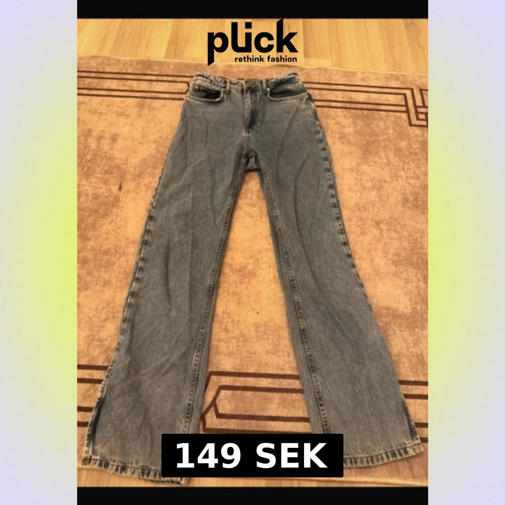 Säljer ett par blå jeans från NA-KD i storlek 36. De har hög midja, raka ben med bred passform och coola slitsar nertill. Klassisk femficksmodell i jeansmaterial, perfekta för en avslappnad och trendig look.