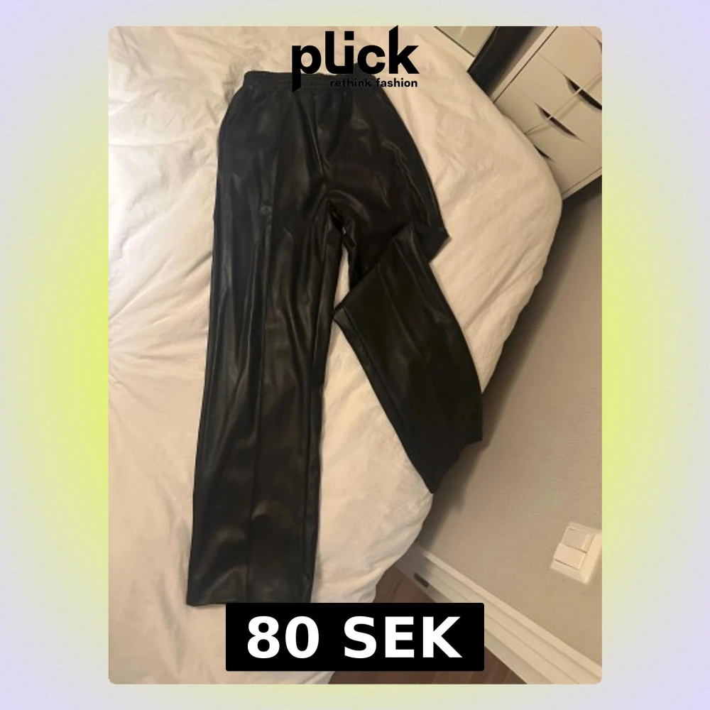 Säljer ett par svarta skinnbyxor från NA-KD i storlek 34. Byxorna har elastisk midja och raka ben med loose passform. Materialet är syntetiskt skinn som ger en snygg och edgy look. Perfekta för dig som vill sticka ut med en cool vibe.